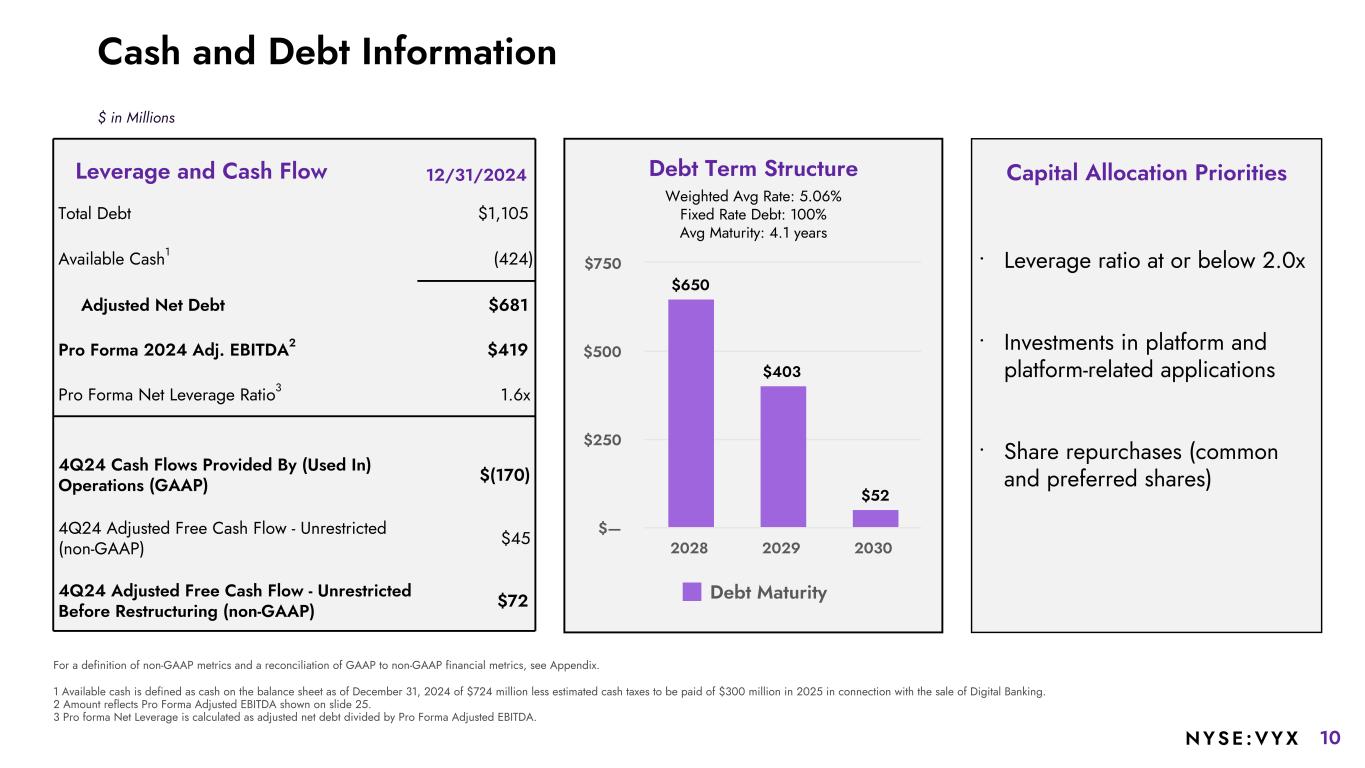 9NYSE :VYX Q4 2024 - Retail Revenue $160 $155 $186 $193 $198 $113 Software Services Hardware 4Q23 4Q24 Recurring vs. Non- Recurring Revenue $257 $270 $287 $191 Recurring Non-Recurring 4Q23 4Q24 +1% Software & Services +5% Recurring +13% Adj. EBITDA22.1% 16.5% +46% platform sites +6% ARR 35+ new customers Adjusted EBITDA (Margin %) $90 $102 4Q23 4Q24 22.1% 16.5% $ in Millions