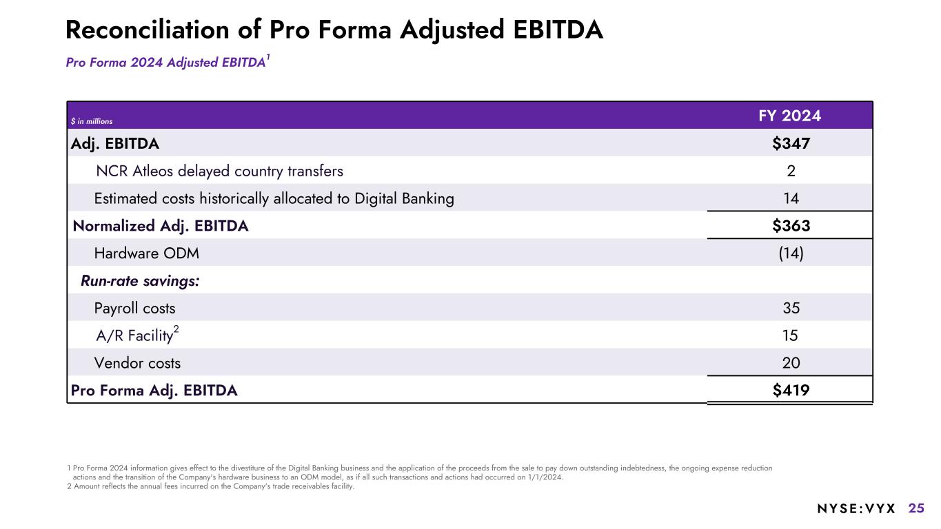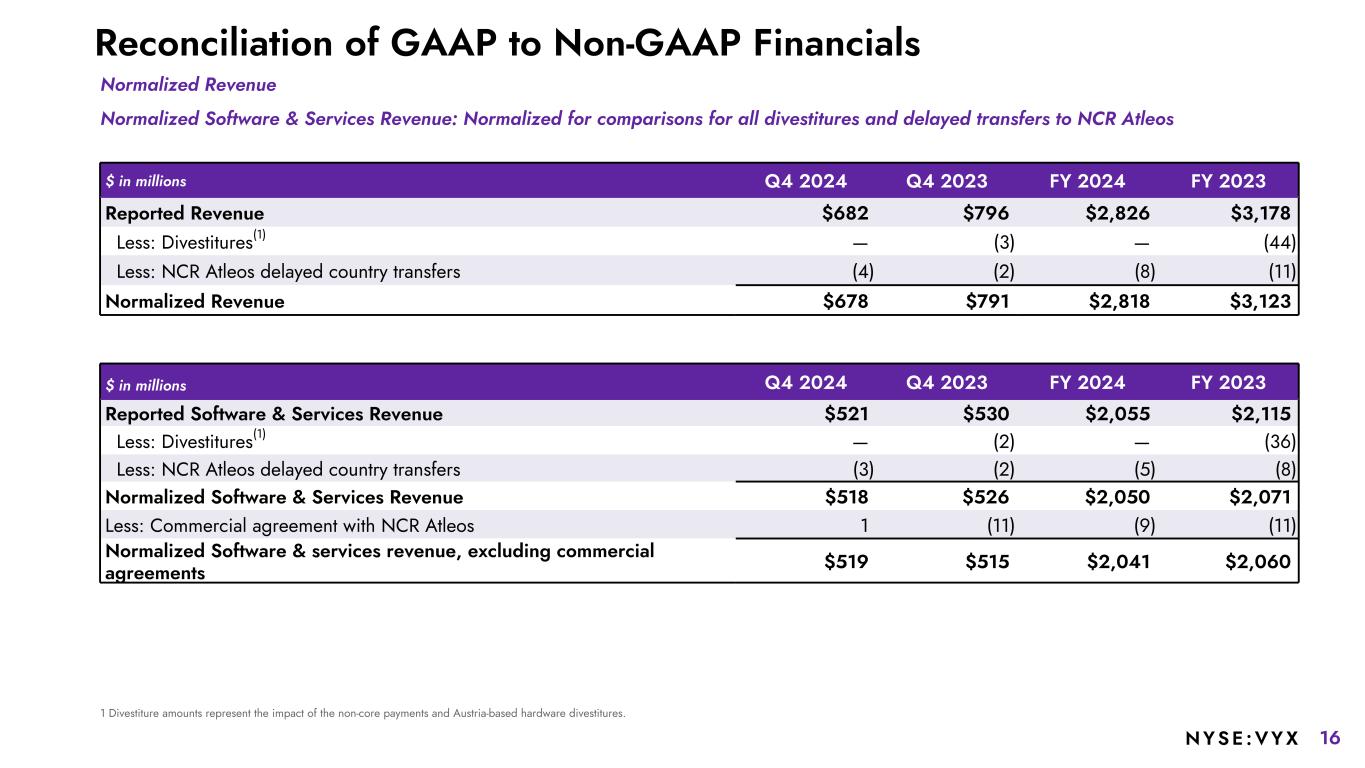 15NYSE :VYX Pro Forma Financial Measures: In this presentation, we present supplemental full year 2024 financial information on a pro forma basis to give effect to the divestiture of the Digital Banking business and the application of the proceeds from the sale to pay down outstanding indebtedness, the ongoing expense reduction actions and the transition of the Company's POS and SCO hardware businesses to an outsourced design and manufacturing (ODM) model, as if all such transactions and actions had occurred on January 1, 2024. These pro forma non-GAAP measures include pro forma revenue, pro forma adjusted EBITDA, pro forma adjusted EBITDA margin, pro forma net leverage ratio, and pro forma adjusted free cash flow-unrestricted. Non-GAAP Reconciliations: The Company’s definitions and calculations of these non-GAAP measures may differ from similarly-titled measures reported by other companies and cannot, therefore, be compared with similarly-titled measures of other companies. These non-GAAP measures should not be considered as substitutes for, or superior to, results determined in accordance with GAAP. With respect to our 2025 performance outlook for Adjusted EBITDA, Adjusted EBITDA margin, Non-GAAP diluted EPS, Adjusted free cash flow-unrestricted, and Adjusted Free Cash Flow Conversion, we are not providing a reconciliation to GAAP net income or Cash flows from Operating Activities because we are not able to predict with reasonable certainty the reconciling items that may affect the GAAP net income from continuing operations or Cash flows from Operating Activities without unreasonable effort. For additional information, refer to Slide 3. USE OF CERTAIN TERMS. As used in these materials: The term “recurring revenue” includes all revenue streams from contracts where there is a predictable revenue pattern that will occur at regular intervals with a relatively high degree of certainty. This includes hardware and software maintenance revenue, cloud revenue, payment processing revenue, and certain professional services arrangements, as well as term-based software license arrangements that include customer termination rights. The Company believes this metric may be useful to investors in evaluating the achievement of strategic goals related to the conversion of the Retail and Restaurant businesses to recurring revenue streams over time. The term “annual recurring revenue” or “ARR” is recurring revenue, excluding software licenses (SWL) sold as a subscription, for the last three months times four. In addition, plus the rolling four quarters of term-based SWL arrangements that include customer termination rights. The term "Software ARR" includes recurring software license revenue, software maintenance revenue, SaaS revenue, standalone hosted contract revenue, professional services recurring revenue and payments revenue. The term “Software & Services Revenue” includes all software, services and payments revenue and excludes hardware revenue. The term “platform sites” includes all sites for which we bill for use of our Commerce platform. The term “payment sites” includes all sites which utilizes NCR Voyix’s payment processing capabilities. Non-GAAP Measures