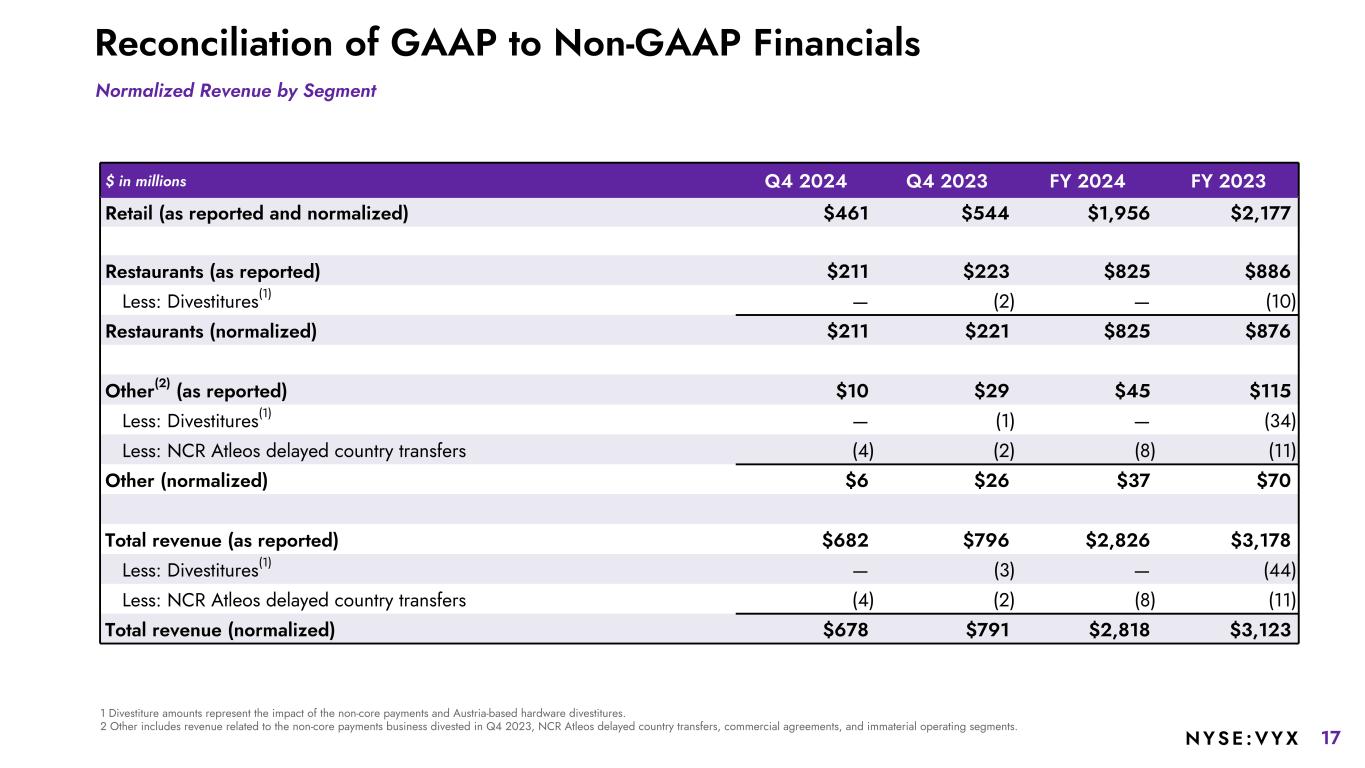 16NYSE :VYX Reconciliation of GAAP to Non-GAAP Financials Normalized Revenue Normalized Software & Services Revenue: Normalized for comparisons for all divestitures and delayed transfers to NCR Atleos $ in millions Q4 2024 Q4 2023 FY 2024 FY 2023 Reported Revenue $682 $796 $2,826 $3,178 Less: Divestitures(1) — (3) — (44) Less: NCR Atleos delayed country transfers (4) (2) (8) (11) Normalized Revenue $678 $791 $2,818 $3,123 $ in millions Q4 2024 Q4 2023 FY 2024 FY 2023 Reported Software & Services Revenue $521 $530 $2,055 $2,115 Less: Divestitures(1) — (2) — (36) Less: NCR Atleos delayed country transfers (3) (2) (5) (8) Normalized Software & Services Revenue $518 $526 $2,050 $2,071 Less: Commercial agreement with NCR Atleos 1 (11) (9) (11) Normalized Software & services revenue, excluding commercial agreements $519 $515 $2,041 $2,060 1 Divestiture amounts represent the impact of the non-core payments and Austria-based hardware divestitures.