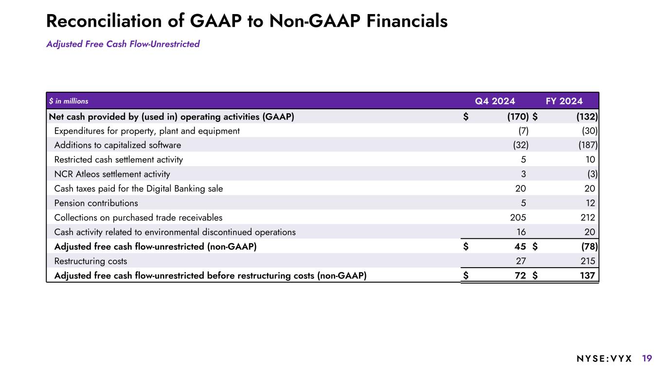 18NYSE :VYX Reconciliation of GAAP to Non-GAAP Financials $ in millions Q4 2024 Q4 2023 FY 2024 FY 2023 Retail Adjusted EBITDA (As Reported) $ 102 $ 90 $ 383 $ 411 Restaurants Adjusted EBITDA (As Reported) $ 68 $ 50 $ 251 $ 197 Other Adjusted EBITDA (As Reported) $ (56) $ (75) $ (287) $ (271) Divestitures(1) — (1) — (19) NCR Atleos delayed country transfers (2) (2) 2 (5) Estimated costs historically allocated to NCR Atleos — 2 — 71 Estimated costs historically allocated to Digital Banking — 7 14 23 Other Normalized Adjusted EBITDA $ (58) $ (69) $ (271) $ (201) NCR Voyix Normalized Adjusted EBITDA $ 112 $ 71 $ 363 $ 407 Segment Adjusted EBITDA Normalized Adjusted EBITDA 1 Divestiture amounts represent the impact of the non-core payments and Austria-based hardware divestitures.