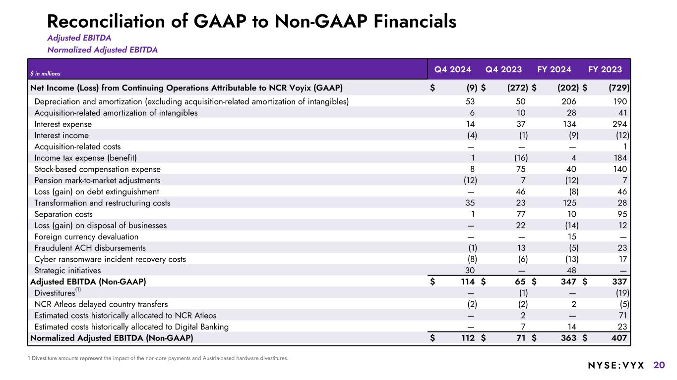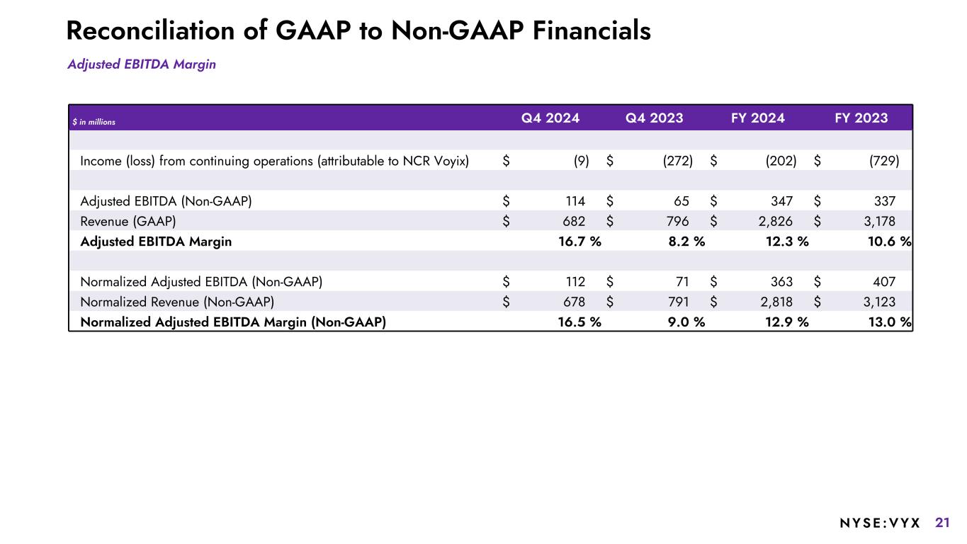 20NYSE :VYX Reconciliation of GAAP to Non-GAAP Financials $ in millions Q4 2024 Q4 2023 FY 2024 FY 2023 Net Income (Loss) from Continuing Operations Attributable to NCR Voyix (GAAP) $ (9) $ (272) $ (202) $ (729) Depreciation and amortization (excluding acquisition-related amortization of intangibles) 53 50 206 190 Acquisition-related amortization of intangibles 6 10 28 41 Interest expense 14 37 134 294 Interest income (4) (1) (9) (12) Acquisition-related costs — — — 1 Income tax expense (benefit) 1 (16) 4 184 Stock-based compensation expense 8 75 40 140 Pension mark-to-market adjustments (12) 7 (12) 7 Loss (gain) on debt extinguishment — 46 (8) 46 Transformation and restructuring costs 35 23 125 28 Separation costs 1 77 10 95 Loss (gain) on disposal of businesses — 22 (14) 12 Foreign currency devaluation — — 15 — Fraudulent ACH disbursements (1) 13 (5) 23 Cyber ransomware incident recovery costs (8) (6) (13) 17 Strategic initiatives 30 — 48 — Adjusted EBITDA (Non-GAAP) $ 114 $ 65 $ 347 $ 337 Divestitures(1) — (1) — (19) NCR Atleos delayed country transfers (2) (2) 2 (5) Estimated costs historically allocated to NCR Atleos — 2 — 71 Estimated costs historically allocated to Digital Banking — 7 14 23 Normalized Adjusted EBITDA (Non-GAAP) $ 112 $ 71 $ 363 $ 407 1 Divestiture amounts represent the impact of the non-core payments and Austria-based hardware divestitures. Adjusted EBITDA Normalized Adjusted EBITDA
