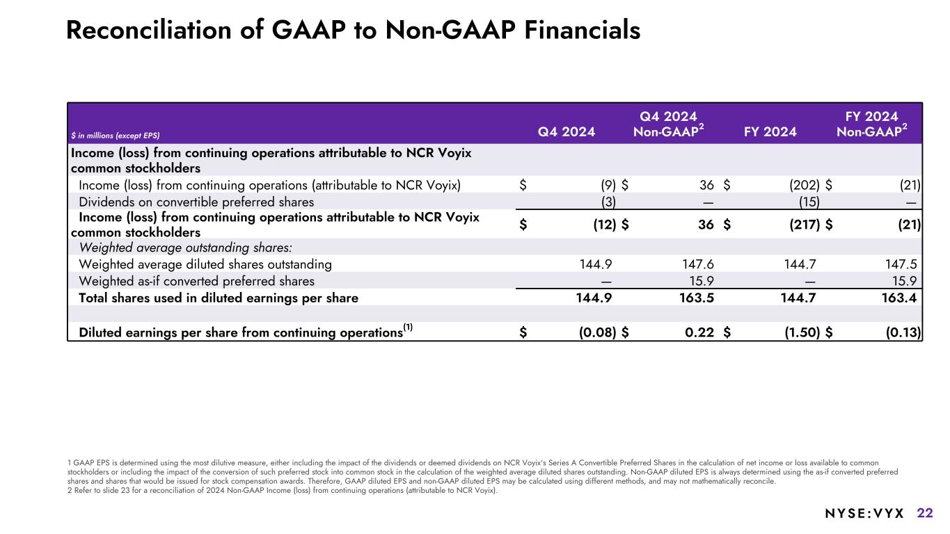 21NYSE :VYX Reconciliation of GAAP to Non-GAAP Financials $ in millions Q4 2024 Q4 2023 FY 2024 FY 2023 Income (loss) from continuing operations (attributable to NCR Voyix) $ (9) $ (272) $ (202) $ (729) Adjusted EBITDA (Non-GAAP) $ 114 $ 65 $ 347 $ 337 Revenue (GAAP) $ 682 $ 796 $ 2,826 $ 3,178 Adjusted EBITDA Margin 16.7 % 8.2 % 12.3 % 10.6 % Normalized Adjusted EBITDA (Non-GAAP) $ 112 $ 71 $ 363 $ 407 Normalized Revenue (Non-GAAP) $ 678 $ 791 $ 2,818 $ 3,123 Normalized Adjusted EBITDA Margin (Non-GAAP) 16.5 % 9.0 % 12.9 % 13.0 % Adjusted EBITDA Margin
