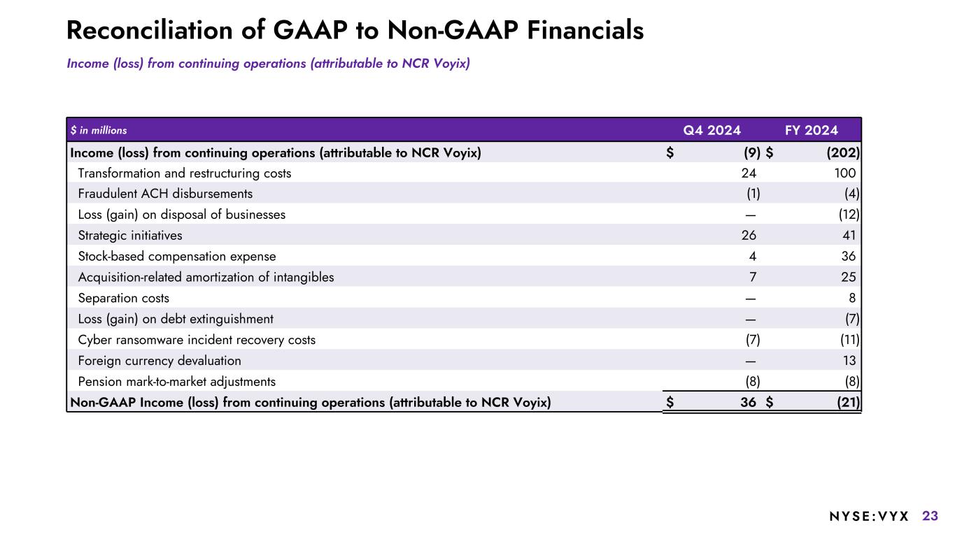 22NYSE :VYX Reconciliation of GAAP to Non-GAAP Financials $ in millions (except EPS) Q4 2024 Q4 2024 Non-GAAP2 FY 2024 FY 2024 Non-GAAP2 Income (loss) from continuing operations attributable to NCR Voyix common stockholders Income (loss) from continuing operations (attributable to NCR Voyix) $ (9) $ 36 $ (202) $ (21) Dividends on convertible preferred shares (3) — (15) — Income (loss) from continuing operations attributable to NCR Voyix common stockholders $ (12) $ 36 $ (217) $ (21) Weighted average outstanding shares: Weighted average diluted shares outstanding 144.9 147.6 144.7 147.5 Weighted as-if converted preferred shares — 15.9 — 15.9 Total shares used in diluted earnings per share 144.9 163.5 144.7 163.4 Diluted earnings per share from continuing operations(1) $ (0.08) $ 0.22 $ (1.50) $ (0.13) 1 GAAP EPS is determined using the most dilutive measure, either including the impact of the dividends or deemed dividends on NCR Voyix's Series A Convertible Preferred Shares in the calculation of net income or loss available to common stockholders or including the impact of the conversion of such preferred stock into common stock in the calculation of the weighted average diluted shares outstanding. Non-GAAP diluted EPS is always determined using the as-if converted preferred shares and shares that would be issued for stock compensation awards. Therefore, GAAP diluted EPS and non-GAAP diluted EPS may be calculated using different methods, and may not mathematically reconcile. 2 Refer to slide 23 for a reconciliation of 2024 Non-GAAP Income (loss) from continuing operations (attributable to NCR Voyix).
