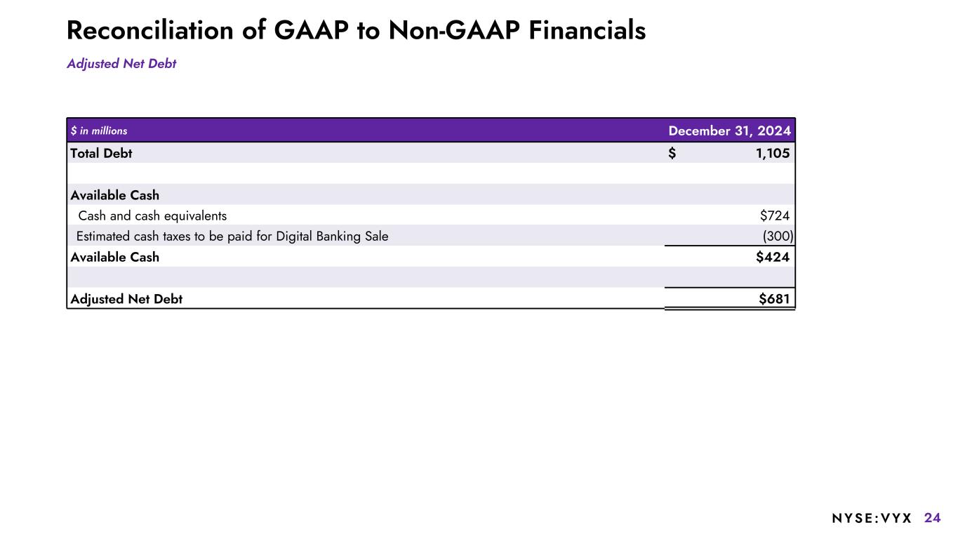24NYSE :VYX Reconciliation of GAAP to Non-GAAP Financials Adjusted Net Debt $ in millions December 31, 2024 Total Debt $ 1,105 Available Cash Cash and cash equivalents $724 Estimated cash taxes to be paid for Digital Banking Sale (300) Available Cash $424 Adjusted Net Debt $681
