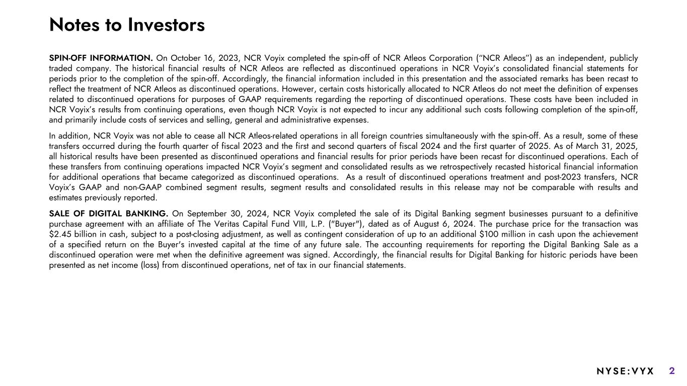 2NYSE :VYX SPIN-OFF INFORMATION. On October 16, 2023, NCR Voyix completed the spin-off of NCR Atleos Corporation (“NCR Atleos”) as an independent, publicly traded company. The historical financial results of NCR Atleos are reflected as discontinued operations in NCR Voyix’s consolidated financial statements for periods prior to the completion of the spin-off. Accordingly, the financial information included in this presentation and the associated remarks has been recast to reflect the treatment of NCR Atleos as discontinued operations. However, certain costs historically allocated to NCR Atleos do not meet the definition of expenses related to discontinued operations for purposes of GAAP requirements regarding the reporting of discontinued operations. These costs have been included in NCR Voyix’s results from continuing operations, even though NCR Voyix is not expected to incur any additional such costs following completion of the spin-off, and primarily include costs of services and selling, general and administrative expenses. In addition, NCR Voyix was not able to cease all NCR Atleos-related operations in all foreign countries simultaneously with the spin-off. As a result, some of these transfers occurred during the fourth quarter of fiscal 2023 and the first and second quarters of fiscal 2024 and the first quarter of 2025. As of March 31, 2025, all historical results have been presented as discontinued operations and financial results for prior periods have been recast for discontinued operations. Each of these transfers from continuing operations impacted NCR Voyix’s segment and consolidated results as we retrospectively recasted historical financial information for additional operations that became categorized as discontinued operations. As a result of discontinued operations treatment and post-2023 transfers, NCR Voyix’s GAAP and non-GAAP combined segment results, segment results and consolidated results in this release may not be comparable with results and estimates previously reported. SALE OF DIGITAL BANKING. On September 30, 2024, NCR Voyix completed the sale of its Digital Banking segment businesses pursuant to a definitive purchase agreement with an affiliate of The Veritas Capital Fund VIII, L.P. ("Buyer"), dated as of August 6, 2024. The purchase price for the transaction was $2.45 billion in cash, subject to a post-closing adjustment, as well as contingent consideration of up to an additional $100 million in cash upon the achievement of a specified return on the Buyer's invested capital at the time of any future sale. The accounting requirements for reporting the Digital Banking Sale as a discontinued operation were met when the definitive agreement was signed. Accordingly, the financial results for Digital Banking for historic periods have been presented as net income (loss) from discontinued operations, net of tax in our financial statements. Notes to Investors
