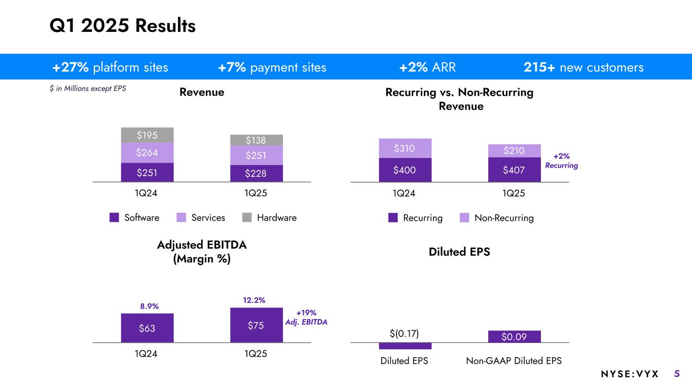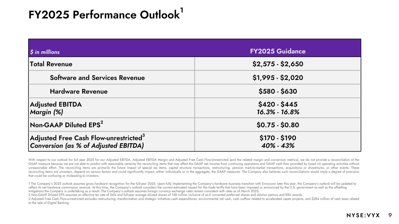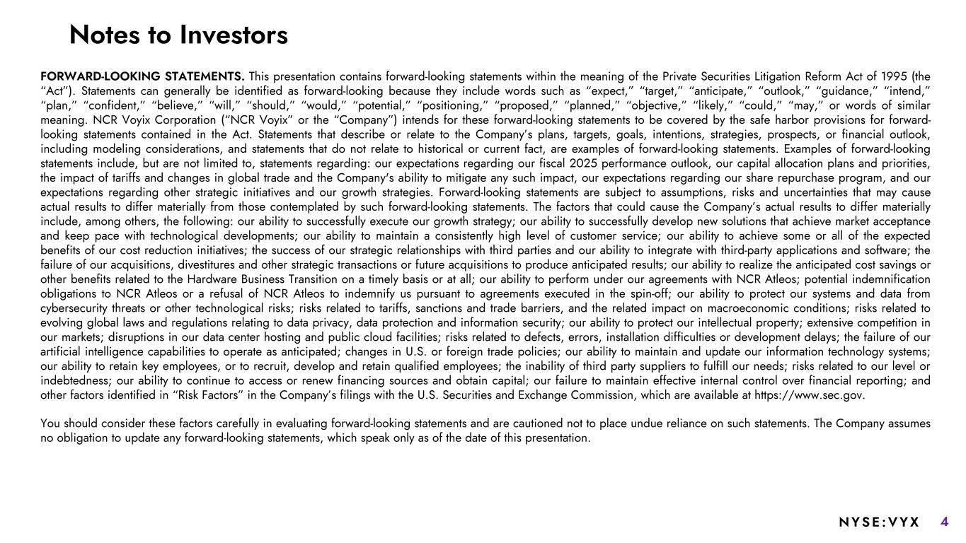 4NYSE :VYX FORWARD-LOOKING STATEMENTS. This presentation contains forward-looking statements within the meaning of the Private Securities Litigation Reform Act of 1995 (the “Act”). Statements can generally be identified as forward-looking because they include words such as “expect,” “target,” “anticipate,” “outlook,” “guidance,” “intend,” “plan,” “confident,” “believe,” “will,” “should,” “would,” “potential,” “positioning,” “proposed,” “planned,” “objective,” “likely,” “could,” “may,” or words of similar meaning. NCR Voyix Corporation (“NCR Voyix” or the “Company”) intends for these forward-looking statements to be covered by the safe harbor provisions for forward- looking statements contained in the Act. Statements that describe or relate to the Company’s plans, targets, goals, intentions, strategies, prospects, or financial outlook, including modeling considerations, and statements that do not relate to historical or current fact, are examples of forward-looking statements. Examples of forward-looking statements include, but are not limited to, statements regarding: our expectations regarding our fiscal 2025 performance outlook, our capital allocation plans and priorities, the impact of tariffs and changes in global trade and the Company's ability to mitigate any such impact, our expectations regarding our share repurchase program, and our expectations regarding other strategic initiatives and our growth strategies. Forward-looking statements are subject to assumptions, risks and uncertainties that may cause actual results to differ materially from those contemplated by such forward-looking statements. The factors that could cause the Company’s actual results to differ materially include, among others, the following: our ability to successfully execute our growth strategy; our ability to successfully develop new solutions that achieve market acceptance and keep pace with technological developments; our ability to maintain a consistently high level of customer service; our ability to achieve some or all of the expected benefits of our cost reduction initiatives; the success of our strategic relationships with third parties and our ability to integrate with third-party applications and software; the failure of our acquisitions, divestitures and other strategic transactions or future acquisitions to produce anticipated results; our ability to realize the anticipated cost savings or other benefits related to the Hardware Business Transition on a timely basis or at all; our ability to perform under our agreements with NCR Atleos; potential indemnification obligations to NCR Atleos or a refusal of NCR Atleos to indemnify us pursuant to agreements executed in the spin-off; our ability to protect our systems and data from cybersecurity threats or other technological risks; risks related to tariffs, sanctions and trade barriers, and the related impact on macroeconomic conditions; risks related to evolving global laws and regulations relating to data privacy, data protection and information security; our ability to protect our intellectual property; extensive competition in our markets; disruptions in our data center hosting and public cloud facilities; risks related to defects, errors, installation difficulties or development delays; the failure of our artificial intelligence capabilities to operate as anticipated; changes in U.S. or foreign trade policies; our ability to maintain and update our information technology systems; our ability to retain key employees, or to recruit, develop and retain qualified employees; the inability of third party suppliers to fulfill our needs; risks related to our level or indebtedness; our ability to continue to access or renew financing sources and obtain capital; our failure to maintain effective internal control over financial reporting; and other factors identified in “Risk Factors” in the Company’s filings with the U.S. Securities and Exchange Commission, which are available at https://www.sec.gov. You should consider these factors carefully in evaluating forward-looking statements and are cautioned not to place undue reliance on such statements. The Company assumes no obligation to update any forward-looking statements, which speak only as of the date of this presentation. Notes to Investors