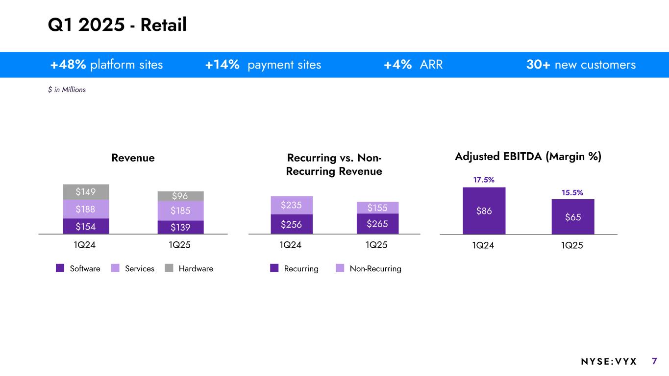6NYSE :VYX Q1 2025 - Restaurants Revenue $90 $86 $66 $64 $46 $41 Software Services Hardware 1Q24 1Q25 Adjusted EBITDA (Margin %) $55 $59 1Q24 1Q25 Recurring vs. Non- Recurring Revenue $139 $138 $63 $53 Recurring Non-Recurring 1Q24 1Q25 30.9%27.2% +5% platform sites +6% payment sites (1)% ARR 185+ new customers $ in Millions