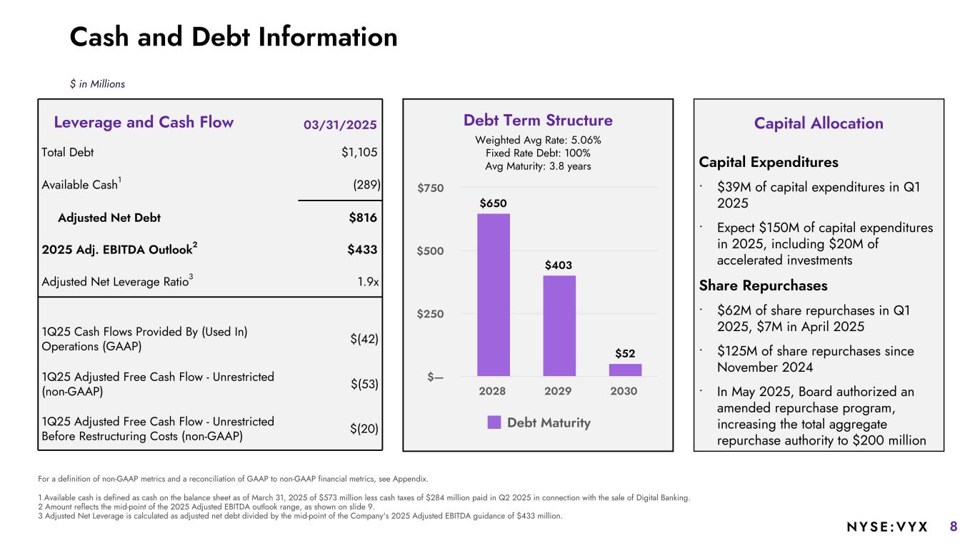 7NYSE :VYX Q1 2025 - Retail Revenue $154 $139 $188 $185 $149 $96 Software Services Hardware 1Q24 1Q25 Recurring vs. Non- Recurring Revenue $256 $265 $235 $155 Recurring Non-Recurring 1Q24 1Q25 #DIV/ 0!22.1% Adjusted EBITDA (Margin %) $86 $65 1Q24 1Q25 15.5% 17.5% $ in Millions +48% platform sites +14% payment sites +4% ARR 30+ new customers