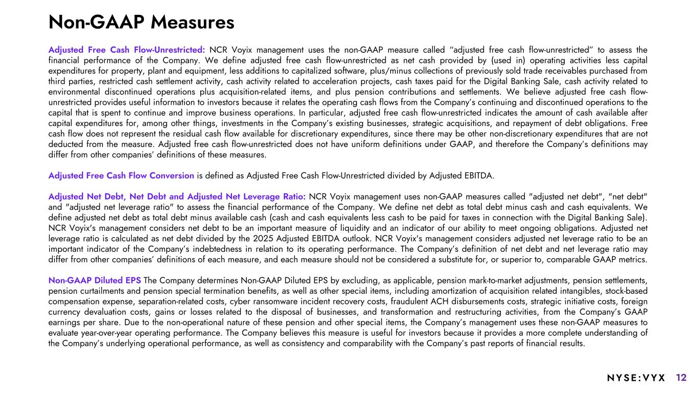 11NYSE :VYX While NCR Voyix reports its results in accordance with generally accepted accounting principles (GAAP) in the United States, comments made during this conference call and in these materials will include non-GAAP measures. These measures are included to provide additional useful information regarding NCR Voyix’s financial results and are not a substitute for their comparable GAAP measures. Adjusted Earnings Before Interest, Taxes, Depreciation and Amortization (Adjusted EBITDA) NCR Voyix determines Adjusted EBITDA for a given period based on its GAAP net income from continuing operations attributable to NCR Voyix plus interest expense, net; plus income tax expense (benefit); plus depreciation and amortization (excluding acquisition-related amortization of intangibles); plus stock-based compensation expense; plus pension mark-to-market adjustments and other special items, including amortization of acquisition-related intangibles, acquisition- related costs, loss (gain) on disposal of businesses, separation-related costs, cyber ransomware incident recovery costs (net of insurance recoveries), fraudulent ACH disbursements costs net of recoveries, foreign currency devaluation, transformation and restructuring charges (which includes integration, severance and other exit and disposal costs), and strategic initiative costs, among others. Separation-related costs include costs incurred as a result of the spin-off. The historical financial information and any forecasted financial information included in this presentation were determined based on the Retail and Restaurants segment results including an estimate of corporate costs, perimeter adjustments as well as the impact from commercial agreements between NCR Voyix and NCR Atleos. The actual historical results may differ from the periods presented based on the GAAP requirements for reporting discontinued operations. NCR Voyix uses Adjusted EBITDA to evaluate and measure the ongoing performance of its business segments. NCR Voyix also uses Adjusted EBITDA to manage and determine the effectiveness of its business managers and as a basis for incentive compensation. NCR Voyix believes that Adjusted EBITDA provides useful information to investors because it is an indicator of the strength and performance of the Company’s ongoing business operations, including its ability to fund discretionary spending such as capital expenditures, strategic acquisitions, and other investments, and excludes certain items whose fluctuation from period to period do not necessarily correspond to changes in the operations of our business segments. In addition, we believe Adjusted EBITDA is useful to investors because it and similar measures are commonly used by industry analysts, investors, and lenders to assess the financial performance of companies in our industry. Adjusted EBITDA margin is calculated based on Adjusted EBITDA as a percentage of total revenue. Non-GAAP Measures