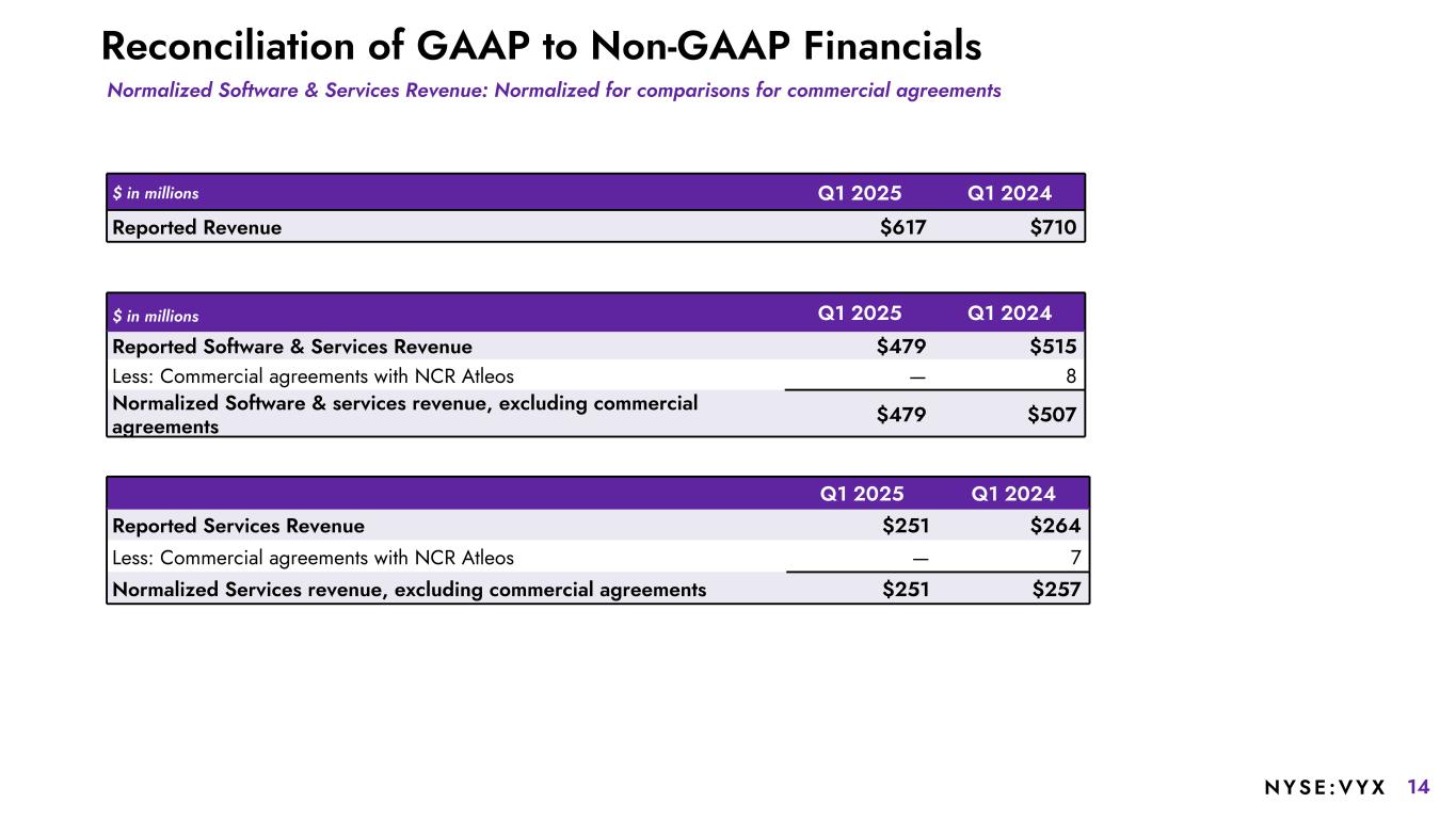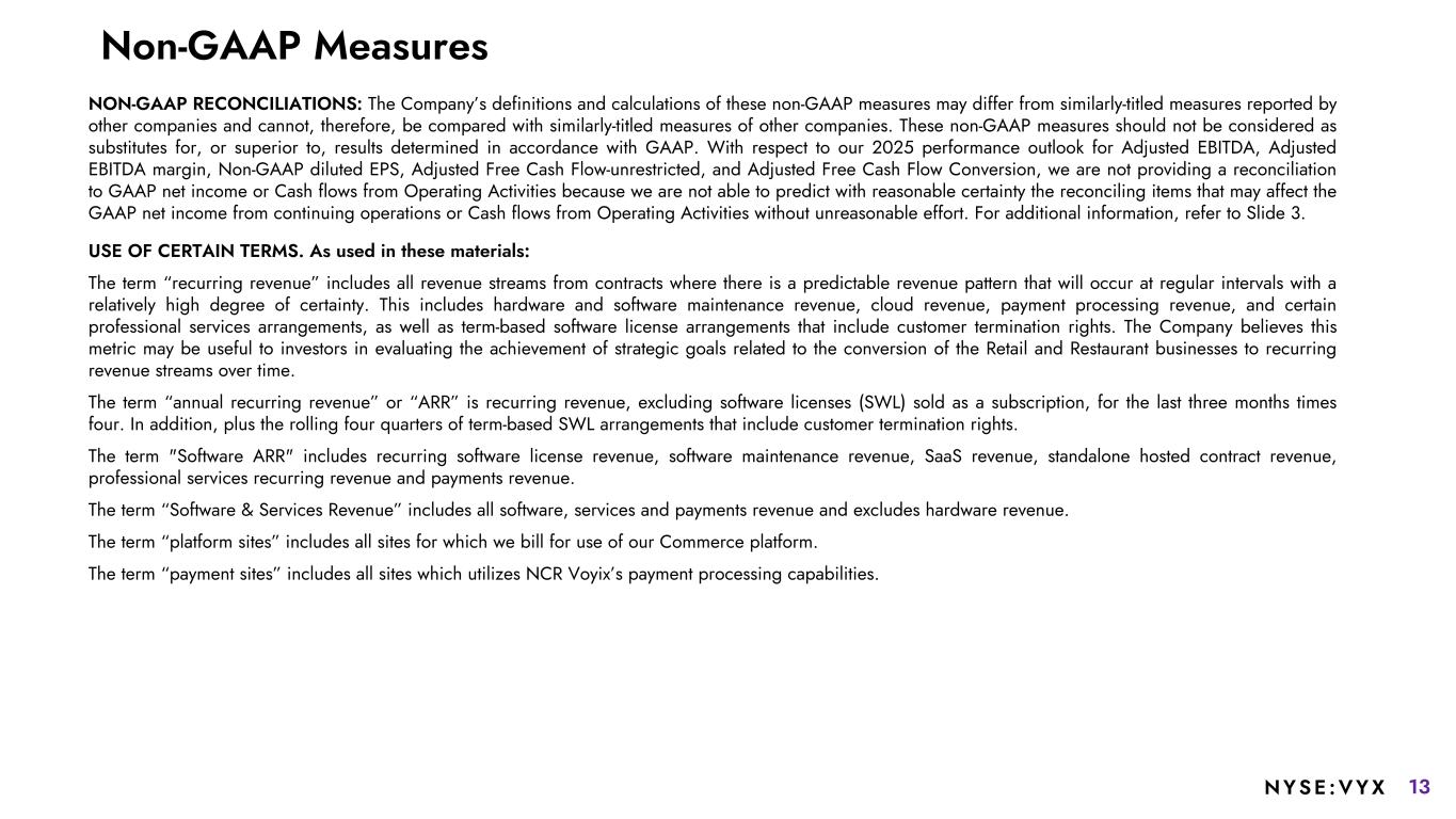 13NYSE :VYX NON-GAAP RECONCILIATIONS: The Company’s definitions and calculations of these non-GAAP measures may differ from similarly-titled measures reported by other companies and cannot, therefore, be compared with similarly-titled measures of other companies. These non-GAAP measures should not be considered as substitutes for, or superior to, results determined in accordance with GAAP. With respect to our 2025 performance outlook for Adjusted EBITDA, Adjusted EBITDA margin, Non-GAAP diluted EPS, Adjusted Free Cash Flow-unrestricted, and Adjusted Free Cash Flow Conversion, we are not providing a reconciliation to GAAP net income or Cash flows from Operating Activities because we are not able to predict with reasonable certainty the reconciling items that may affect the GAAP net income from continuing operations or Cash flows from Operating Activities without unreasonable effort. For additional information, refer to Slide 3. USE OF CERTAIN TERMS. As used in these materials: The term “recurring revenue” includes all revenue streams from contracts where there is a predictable revenue pattern that will occur at regular intervals with a relatively high degree of certainty. This includes hardware and software maintenance revenue, cloud revenue, payment processing revenue, and certain professional services arrangements, as well as term-based software license arrangements that include customer termination rights. The Company believes this metric may be useful to investors in evaluating the achievement of strategic goals related to the conversion of the Retail and Restaurant businesses to recurring revenue streams over time. The term “annual recurring revenue” or “ARR” is recurring revenue, excluding software licenses (SWL) sold as a subscription, for the last three months times four. In addition, plus the rolling four quarters of term-based SWL arrangements that include customer termination rights. The term "Software ARR" includes recurring software license revenue, software maintenance revenue, SaaS revenue, standalone hosted contract revenue, professional services recurring revenue and payments revenue. The term “Software & Services Revenue” includes all software, services and payments revenue and excludes hardware revenue. The term “platform sites” includes all sites for which we bill for use of our Commerce platform. The term “payment sites” includes all sites which utilizes NCR Voyix’s payment processing capabilities. Non-GAAP Measures