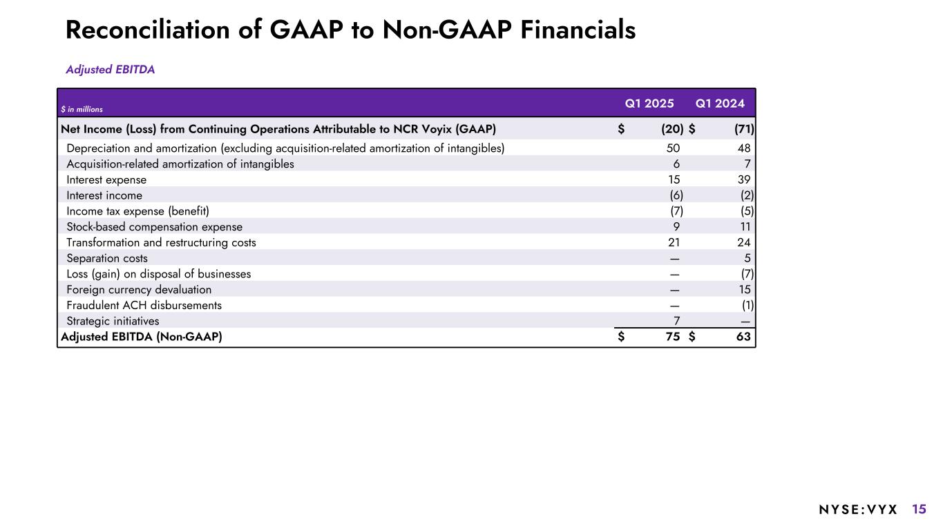 14NYSE :VYX Reconciliation of GAAP to Non-GAAP Financials Normalized Software & Services Revenue: Normalized for comparisons for commercial agreements $ in millions Q1 2025 Q1 2024 Reported Revenue $617 $710 $ in millions Q1 2025 Q1 2024 Reported Software & Services Revenue $479 $515 Less: Commercial agreements with NCR Atleos — 8 Normalized Software & services revenue, excluding commercial agreements $479 $507 Q1 2025 Q1 2024 Reported Services Revenue $251 $264 Less: Commercial agreements with NCR Atleos — 7 Normalized Services revenue, excluding commercial agreements $251 $257