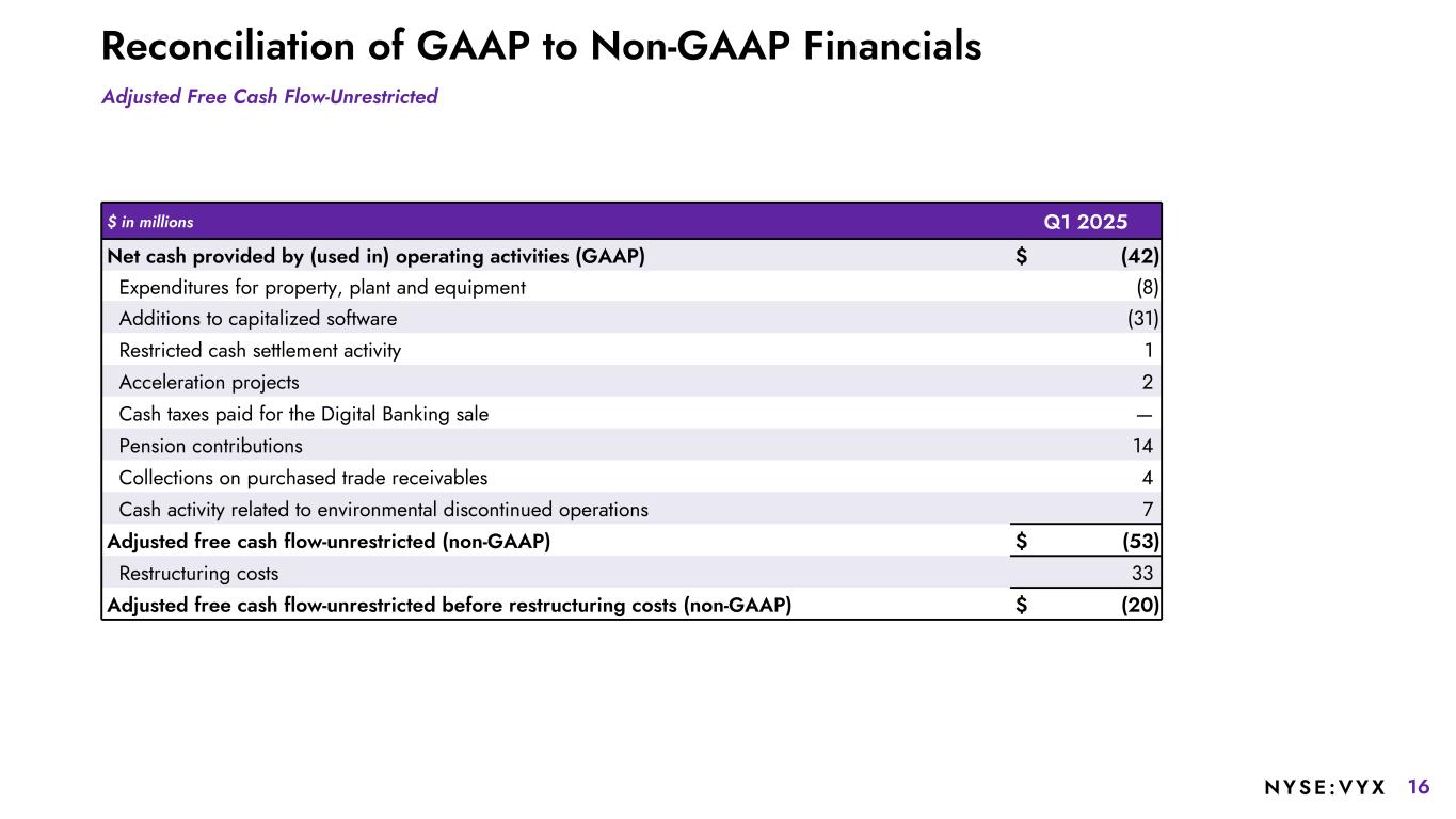 15NYSE :VYX Reconciliation of GAAP to Non-GAAP Financials $ in millions Q1 2025 Q1 2024 Net Income (Loss) from Continuing Operations Attributable to NCR Voyix (GAAP) $ (20) $ (71) Depreciation and amortization (excluding acquisition-related amortization of intangibles) 50 48 Acquisition-related amortization of intangibles 6 7 Interest expense 15 39 Interest income (6) (2) Income tax expense (benefit) (7) (5) Stock-based compensation expense 9 11 Transformation and restructuring costs 21 24 Separation costs — 5 Loss (gain) on disposal of businesses — (7) Foreign currency devaluation — 15 Fraudulent ACH disbursements — (1) Strategic initiatives 7 — Adjusted EBITDA (Non-GAAP) $ 75 $ 63 Adjusted EBITDA