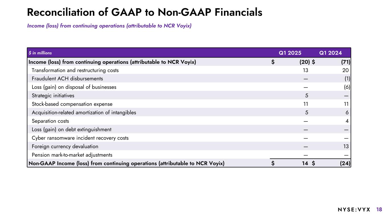 17NYSE :VYX Reconciliation of GAAP to Non-GAAP Financials $ in millions (except EPS) Q1 2025 Q1 2025 Non-GAAP2 Q1 2024 Q1 2024 Non-GAAP2 Income (loss) from continuing operations attributable to NCR Voyix common stockholders Income (loss) from continuing operations (attributable to NCR Voyix) $ (20) $ 14 $ (71) $ (24) Dividends on convertible preferred shares (4) — (4) — Income (loss) from continuing operations attributable to NCR Voyix common stockholders $ (24) $ 14 $ (75) $ (24) Weighted average outstanding shares: Weighted average diluted shares outstanding 139.9 142.1 143.5 146.8 Weighted as-if converted preferred shares — 15.9 — 15.9 Total shares used in diluted earnings per share 139.9 158.0 143.5 162.7 Diluted earnings per share from continuing operations(1) $ (0.17) $ 0.09 $ (0.52) $ (0.15) 1 GAAP EPS is determined using the most dilutive measure, either including the impact of the dividends or deemed dividends on NCR Voyix's Series A Convertible Preferred Shares in the calculation of net income or loss available to common stockholders or including the impact of the conversion of such preferred stock into common stock in the calculation of the weighted average diluted shares outstanding. Non-GAAP diluted EPS is always determined using the as-if converted preferred shares and shares that would be issued for stock compensation awards. Therefore, GAAP diluted EPS and non-GAAP diluted EPS may be calculated using different methods, and may not mathematically reconcile. 2 Refer to slide 18 for a reconciliation of Non-GAAP Income (loss) from continuing operations (attributable to NCR Voyix).