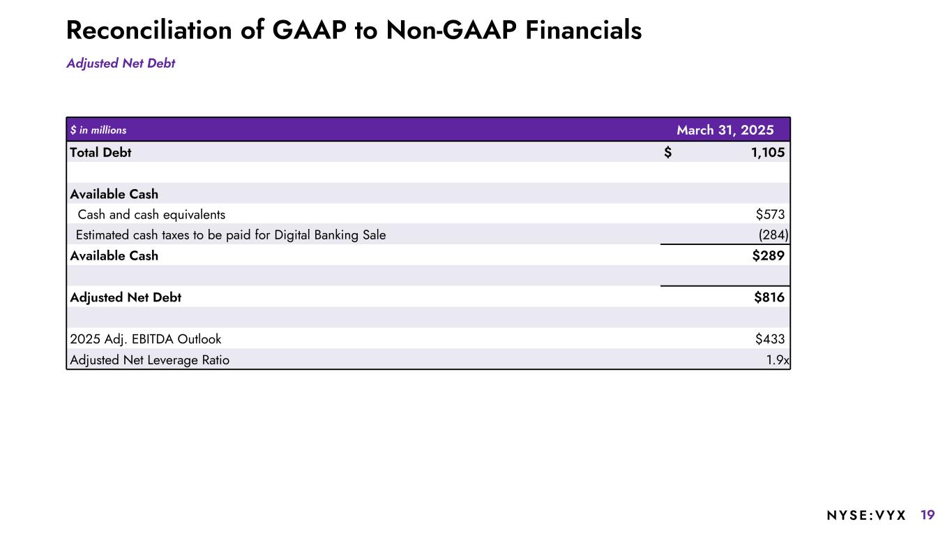 19NYSE :VYX Reconciliation of GAAP to Non-GAAP Financials Adjusted Net Debt $ in millions March 31, 2025 Total Debt $ 1,105 Available Cash Cash and cash equivalents $573 Estimated cash taxes to be paid for Digital Banking Sale (284) Available Cash $289 Adjusted Net Debt $816 2025 Adj. EBITDA Outlook $433 Adjusted Net Leverage Ratio 1.9x