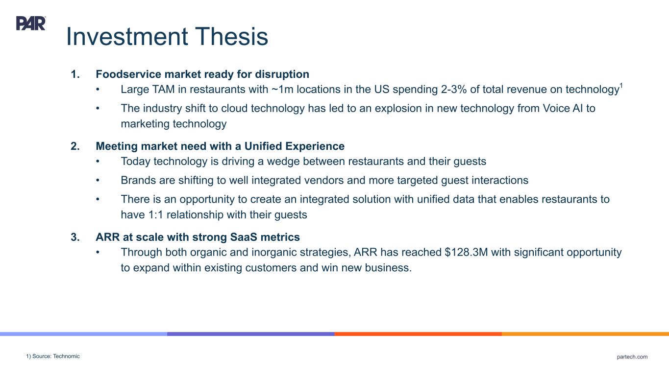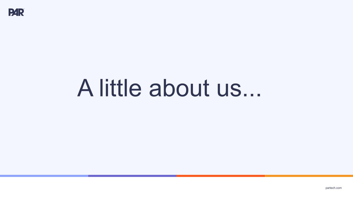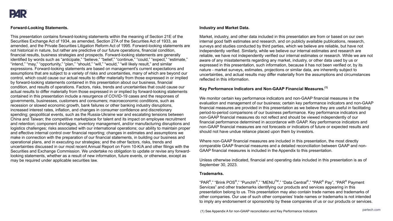 partech.com Forward-Looking Statements. This presentation contains forward-looking statements within the meaning of Section 21E of the Securities Exchange Act of 1934, as amended, Section 27A of the Securities Act of 1933, as amended, and the Private Securities Litigation Reform Act of 1995. Forward-looking statements are not historical in nature, but rather are predictive of our future operations, financial condition, financial results, business strategies and prospects. Forward-looking statements are generally identified by words such as “anticipate,” “believe,” “belief,” “continue,” “could,” “expect,” “estimate,” “intend,” “may,” “opportunity,” “plan,” “should,” “will,” “would,” “will likely result,” and similar expressions. Forward-looking statements are based on management's current expectations and assumptions that are subject to a variety of risks and uncertainties, many of which are beyond our control, which could cause our actual results to differ materially from those expressed in or implied by forward-looking statements contained in this presentation about our business, financial condition, and results of operations. Factors, risks, trends and uncertainties that could cause our actual results to differ materially from those expressed in or implied by forward-looking statements contained in this presentation include a resurgence of COVID-19 cases and the responses of governments, businesses, customers and consumers; macroeconomic conditions, such as recession or slowed economic growth, bank failures or other banking industry disruptions, increased interest rates, inflation, and changes in consumer confidence and discretionary spending; geopolitical events, such as the Russia-Ukraine war and escalating tensions between China and Taiwan; the competitive marketplace for talent and its impact on employee recruitment and retention; component shortages, inventory management, and/or manufacturing disruptions and logistics challenges; risks associated with our international operations; our ability to maintain proper and effective internal control over financial reporting; changes in estimates and assumptions we make in connection with the preparation of our financial statements, in building our business and operational plans, and in executing our strategies; and the other factors, risks, trends and uncertainties discussed in our most recent Annual Report on Form 10-K/A and other filings with the Securities and Exchange Commission. We undertake no obligation to update or revise any forward- looking statements, whether as a result of new information, future events, or otherwise, except as may be required under applicable securities law. Industry and Market Data. Market, industry, and other data included in this presentation are from or based on our own internal good faith estimates and research, and on publicly available publications, research, surveys and studies conducted by third parties, which we believe are reliable, but have not independently verified. Similarly, while we believe our internal estimates and research are reliable, we have not independently verified our internal estimates or research. While we are not aware of any misstatements regarding any market, industry, or other data used by us or expressed in this presentation, such information, because it has not been verified or, by its nature - market surveys, estimates, projections or similar data, are inherently subject to uncertainties, and actual results may differ materially from the assumptions and circumstances reflected in this information. Key Performance Indicators and Non-GAAP Financial Measures.(1) We monitor certain key performance indicators and non-GAAP financial measures in the evaluation and management of our business; certain key performance indicators and non-GAAP financial measures are provided in this presentation as we believe they are useful in facilitating period-to-period comparisons of our business performance. Key performance indicators and non-GAAP financial measures do not reflect and should be viewed independently of our financial performance determined in accordance with GAAP. Key performance indicators and non-GAAP financial measures are not forecasts or indicators of future or expected results and should not have undue reliance placed upon them by investors. Where non-GAAP financial measures are included in this presentation, the most directly comparable GAAP financial measures and a detailed reconciliation between GAAP and non- GAAP financial measures is included in the Appendix to this presentation. Unless otherwise indicated, financial and operating data included in this presentation is as of September 30, 2023. Trademarks. “PAR®,” “Brink POS®,” “Punchh®,” “MENUTM,” “Data Central®,” "PAR® Pay”, “PAR® Payment Services” and other trademarks identifying our products and services appearing in this presentation belong to us. This presentation may also contain trade names and trademarks of other companies. Our use of such other companies’ trade names or trademarks is not intended to imply any endorsement or sponsorship by these companies of us or our products or services. (1) See Appendix A for non-GAAP reconciliation and Key Performance Indicators