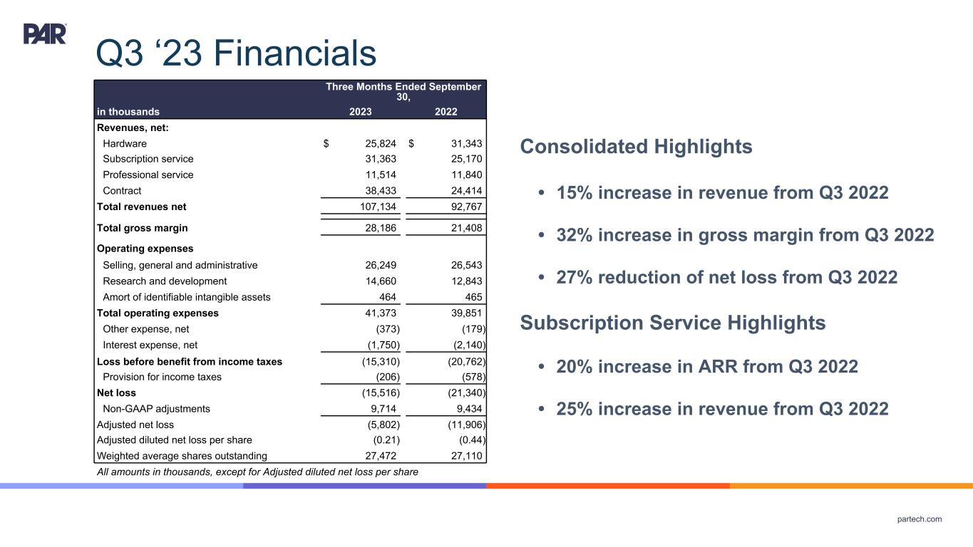 partech.com Q3 ‘23 Financials Consolidated Highlights • 15% increase in revenue from Q3 2022 • 32% increase in gross margin from Q3 2022 • 27% reduction of net loss from Q3 2022 Subscription Service Highlights • 20% increase in ARR from Q3 2022 • 25% increase in revenue from Q3 2022 Three Months Ended September 30, in thousands 2023 2022 Revenues, net: Hardware $ 25,824 $ 31,343 Subscription service 31,363 25,170 Professional service 11,514 11,840 Contract 38,433 24,414 Total revenues net 107,134 92,767 Total gross margin 28,186 21,408 Operating expenses Selling, general and administrative 26,249 26,543 Research and development 14,660 12,843 Amort of identifiable intangible assets 464 465 Total operating expenses 41,373 39,851 Other expense, net (373) (179) Interest expense, net (1,750) (2,140) Loss before benefit from income taxes (15,310) (20,762) Provision for income taxes (206) (578) Net loss (15,516) (21,340) Non-GAAP adjustments 9,714 9,434 Adjusted net loss (5,802) (11,906) Adjusted diluted net loss per share (0.21) (0.44) Weighted average shares outstanding 27,472 27,110 All amounts in thousands, except for Adjusted diluted net loss per share