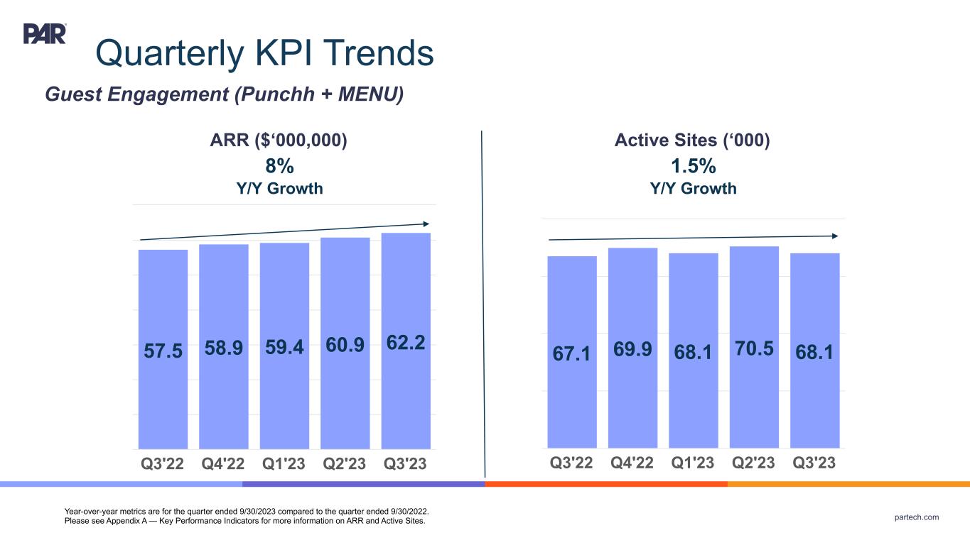 partech.com Quarterly KPI Trends ARR ($‘000,000) 57.5 58.9 59.4 60.9 62.2 Q3'22 Q4'22 Q1'23 Q2'23 Q3'23 8% Y/Y Growth Active Sites (‘000) 67.1 69.9 68.1 70.5 68.1 Q3'22 Q4'22 Q1'23 Q2'23 Q3'23 1.5% Y/Y Growth Guest Engagement (Punchh + MENU) Year-over-year metrics are for the quarter ended 9/30/2023 compared to the quarter ended 9/30/2022. Please see Appendix A — Key Performance Indicators for more information on ARR and Active Sites.