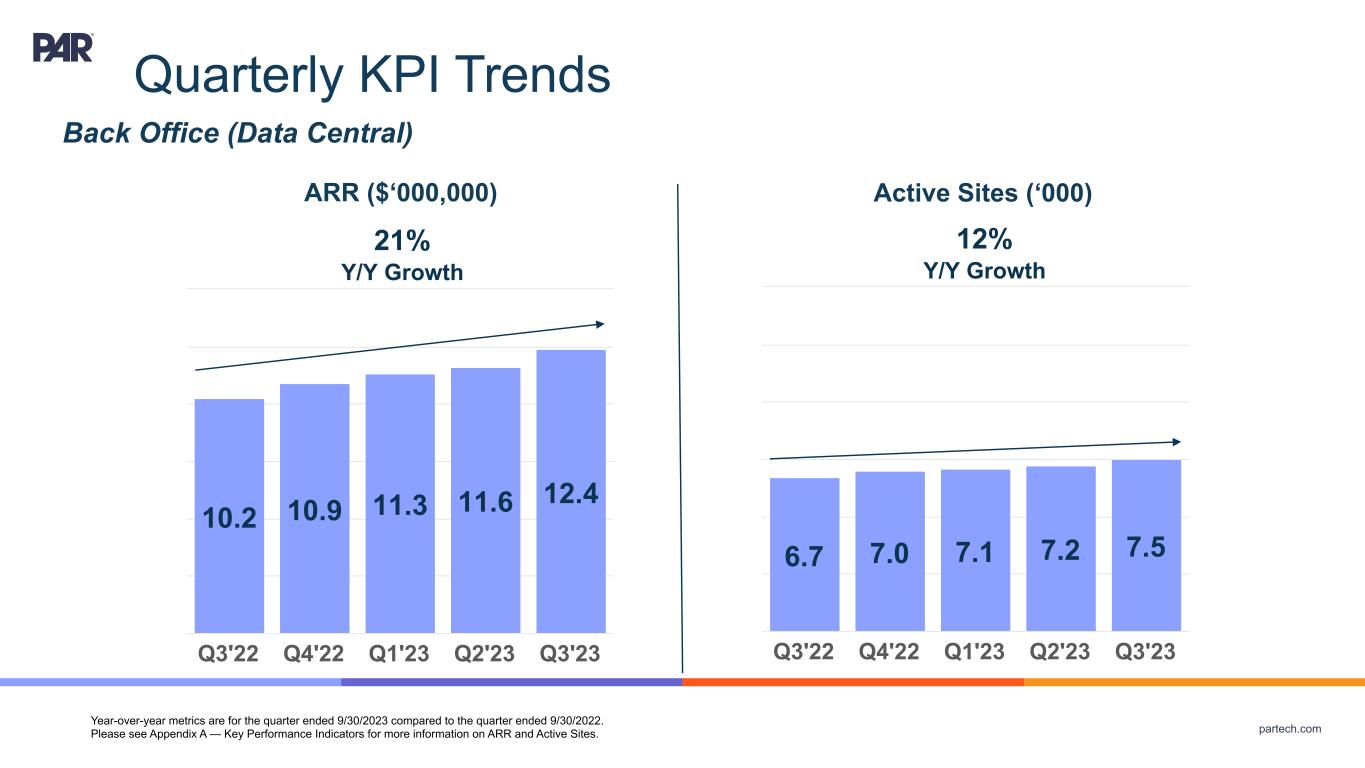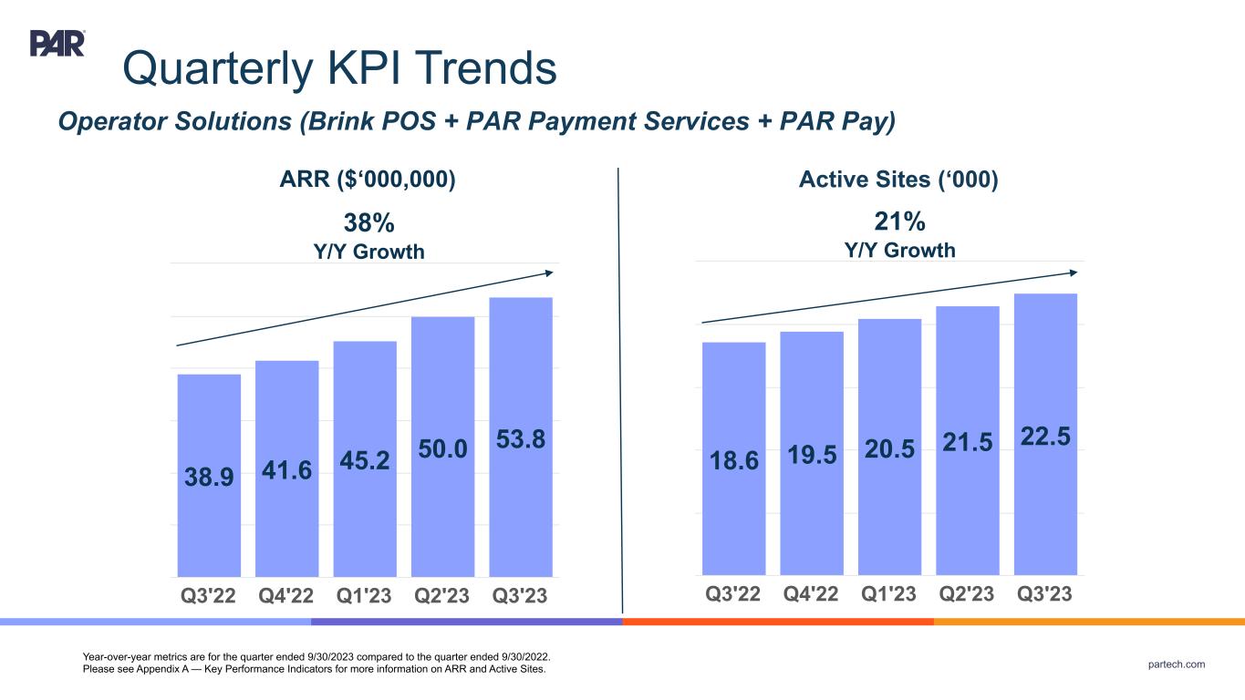 partech.com Quarterly KPI Trends Operator Solutions (Brink POS + PAR Payment Services + PAR Pay) ARR ($‘000,000) Year-over-year metrics are for the quarter ended 9/30/2023 compared to the quarter ended 9/30/2022. Please see Appendix A — Key Performance Indicators for more information on ARR and Active Sites. 38.9 41.6 45.2 50.0 53.8 Q3'22 Q4'22 Q1'23 Q2'23 Q3'23 38% Y/Y Growth Active Sites (‘000) 18.6 19.5 20.5 21.5 22.5 Q3'22 Q4'22 Q1'23 Q2'23 Q3'23 21% Y/Y Growth