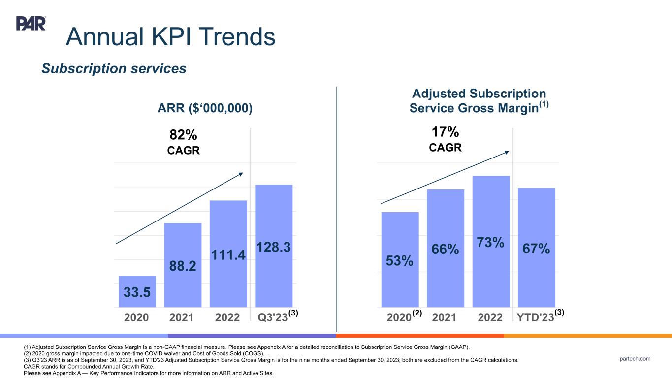 partech.com Annual KPI Trends ARR ($‘000,000) (1) Adjusted Subscription Service Gross Margin is a non-GAAP financial measure. Please see Appendix A for a detailed reconciliation to Subscription Service Gross Margin (GAAP). (2) 2020 gross margin impacted due to one-time COVID waiver and Cost of Goods Sold (COGS). (3) Q3'23 ARR is as of September 30, 2023, and YTD'23 Adjusted Subscription Service Gross Margin is for the nine months ended September 30, 2023; both are excluded from the CAGR calculations. CAGR stands for Compounded Annual Growth Rate. Please see Appendix A — Key Performance Indicators for more information on ARR and Active Sites. 33.5 88.2 111.4 128.3 2020 2021 2022 Q3'23 Subscription services 82% CAGR Adjusted Subscription Service Gross Margin(1) 17% CAGR 53% 66% 73% 67% 2020 2021 2022 YTD'23(3) (3) (2)