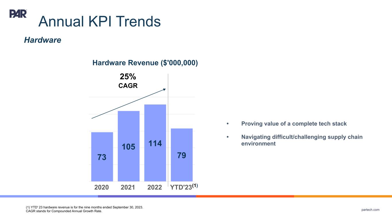 partech.com Annual KPI Trends Hardware Revenue ($'000,000) (1) YTD' 23 hardware revenue is for the nine months ended September 30, 2023. CAGR stands for Compounded Annual Growth Rate. • Proving value of a complete tech stack • Navigating difficult/challenging supply chain environment Hardware 73 105 114 79 2020 2021 2022 YTD'23 25% CAGR (1)