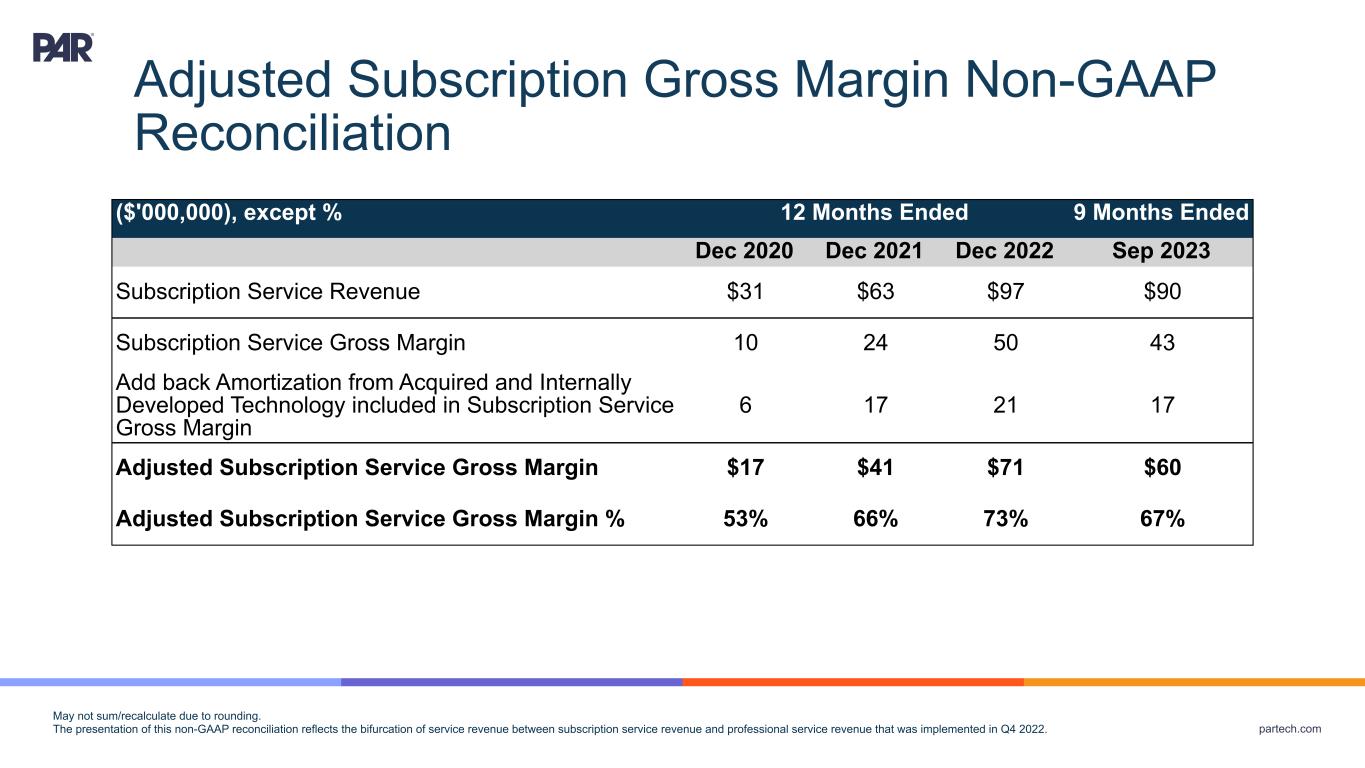 partech.com ($'000,000), except % 12 Months Ended 9 Months Ended Dec 2020 Dec 2021 Dec 2022 Sep 2023 Subscription Service Revenue $31 $63 $97 $90 Subscription Service Gross Margin 10 24 50 43 Add back Amortization from Acquired and Internally Developed Technology included in Subscription Service Gross Margin 6 17 21 17 Adjusted Subscription Service Gross Margin $17 $41 $71 $60 Adjusted Subscription Service Gross Margin % 53% 66% 73% 67% May not sum/recalculate due to rounding. The presentation of this non-GAAP reconciliation reflects the bifurcation of service revenue between subscription service revenue and professional service revenue that was implemented in Q4 2022. Adjusted Subscription Gross Margin Non-GAAP Reconciliation