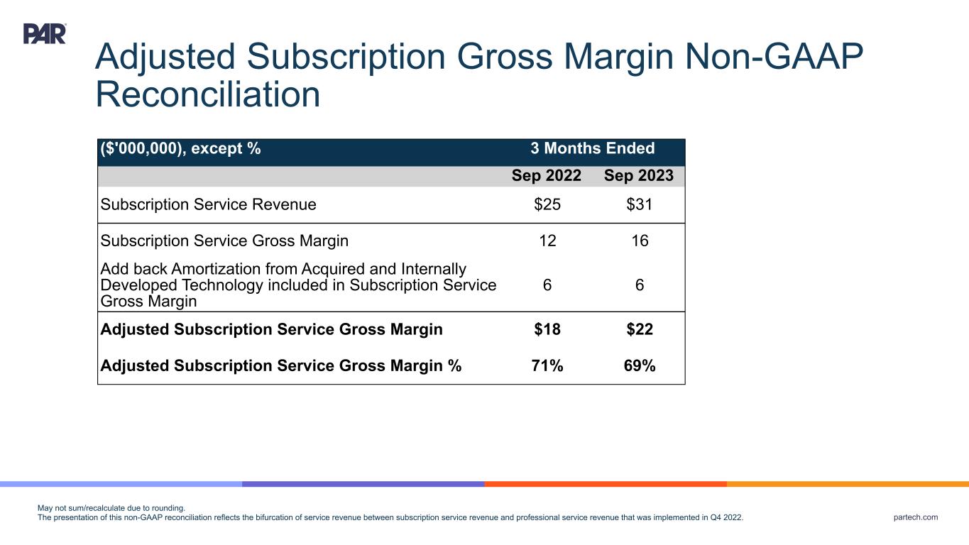 partech.com ($'000,000), except % 3 Months Ended Sep 2022 Sep 2023 Subscription Service Revenue $25 $31 Subscription Service Gross Margin 12 16 Add back Amortization from Acquired and Internally Developed Technology included in Subscription Service Gross Margin 6 6 Adjusted Subscription Service Gross Margin $18 $22 Adjusted Subscription Service Gross Margin % 71% 69% May not sum/recalculate due to rounding. The presentation of this non-GAAP reconciliation reflects the bifurcation of service revenue between subscription service revenue and professional service revenue that was implemented in Q4 2022. Adjusted Subscription Gross Margin Non-GAAP Reconciliation