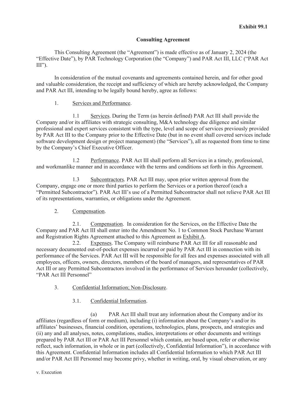 v. Execution Consulting Agreement This Consulting Agreement (the “Agreement”) is made effective as of January 2, 2024 (the “Effective Date”), by PAR Technology Corporation (the “Company”) and PAR Act III, LLC (“PAR Act III”). In consideration of the mutual covenants and agreements contained herein, and for other good and valuable consideration, the receipt and sufficiency of which are hereby acknowledged, the Company and PAR Act III, intending to be legally bound hereby, agree as follows: 1. Services and Performance. 1.1 Services. During the Term (as herein defined) PAR Act III shall provide the Company and/or its affiliates with strategic consulting, M&A technology due diligence and similar professional and expert services consistent with the type, level and scope of services previously provided by PAR Act III to the Company prior to the Effective Date (but in no event shall covered services include software development design or project management) (the “Services”), all as requested from time to time by the Company’s Chief Executive Officer. 1.2 Performance. PAR Act III shall perform all Services in a timely, professional, and workmanlike manner and in accordance with the terms and conditions set forth in this Agreement. 1.3 Subcontractors. PAR Act III may, upon prior written approval from the Company, engage one or more third parties to perform the Services or a portion thereof (each a “Permitted Subcontractor”). PAR Act III’s use of a Permitted Subcontractor shall not relieve PAR Act III of its representations, warranties, or obligations under the Agreement. 2. Compensation. 2.1. Compensation. In consideration for the Services, on the Effective Date the Company and PAR Act III shall enter into the Amendment No. 1 to Common Stock Purchase Warrant and Registration Rights Agreement attached to this Agreement as Exhibit A. 2.2. Expenses. The Company will reimburse PAR Act III for all reasonable and necessary documented out-of-pocket expenses incurred or paid by PAR Act III in connection with its performance of the Services. PAR Act III will be responsible for all fees and expenses associated with all employees, officers, owners, directors, members of the board of managers, and representatives of PAR Act III or any Permitted Subcontractors involved in the performance of Services hereunder (collectively, “PAR Act III Personnel” 3. Confidential Information; Non-Disclosure. 3.1. Confidential Information. (a) PAR Act III shall treat any information about the Company and/or its affiliates (regardless of form or medium), including (i) information about the Company’s and/or its affiliates’ businesses, financial condition, operations, technologies, plans, prospects, and strategies and (ii) any and all analyses, notes, compilations, studies, interpretations or other documents and writings prepared by PAR Act III or PAR Act III Personnel which contain, are based upon, refer or otherwise reflect, such information, in whole or in part (collectively, Confidential Information”), in accordance with this Agreement. Confidential Information includes all Confidential Information to which PAR Act III and/or PAR Act III Personnel may become privy, whether in writing, oral, by visual observation, or any Exhibit 99.1