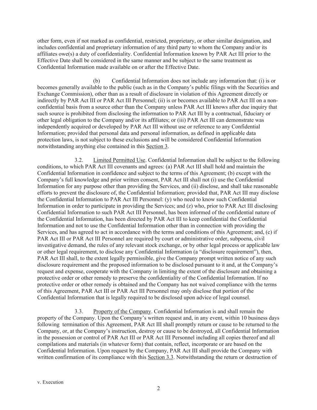 v. Execution 2 other form, even if not marked as confidential, restricted, proprietary, or other similar designation, and includes confidential and proprietary information of any third party to whom the Company and/or its affiliates owe(s) a duty of confidentiality. Confidential Information known by PAR Act III prior to the Effective Date shall be considered in the same manner and be subject to the same treatment as Confidential Information made available on or after the Effective Date. (b) Confidential Information does not include any information that: (i) is or becomes generally available to the public (such as in the Company’s public filings with the Securities and Exchange Commission), other than as a result of disclosure in violation of this Agreement directly or indirectly by PAR Act III or PAR Act III Personnel; (ii) is or becomes available to PAR Act III on a non- confidential basis from a source other than the Company unless PAR Act III knows after due inquiry that such source is prohibited from disclosing the information to PAR Act III by a contractual, fiduciary or other legal obligation to the Company and/or its affiliates; or (iii) PAR Act III can demonstrate was independently acquired or developed by PAR Act III without use or reference to any Confidential Information; provided that personal data and personal information, as defined in applicable data protection laws, is not subject to these exclusions and will be considered Confidential Information notwithstanding anything else contained in this Section 3. 3.2. Limited Permitted Use. Confidential Information shall be subject to the following conditions, to which PAR Act III covenants and agrees: (a) PAR Act III shall hold and maintain the Confidential Information in confidence and subject to the terms of this Agreement; (b) except with the Company’s full knowledge and prior written consent, PAR Act III shall not (i) use the Confidential Information for any purpose other than providing the Services, and (ii) disclose, and shall take reasonable efforts to prevent the disclosure of, the Confidential Information; provided that, PAR Act III may disclose the Confidential Information to PAR Act III Personnel: (y) who need to know such Confidential Information in order to participate in providing the Services; and (z) who, prior to PAR Act III disclosing Confidential Information to such PAR Act III Personnel, has been informed of the confidential nature of the Confidential Information, has been directed by PAR Act III to keep confidential the Confidential Information and not to use the Confidential Information other than in connection with providing the Services, and has agreed to act in accordance with the terms and conditions of this Agreement; and, (c) if PAR Act III or PAR Act III Personnel are required by court or administrative order, subpoena, civil investigative demand, the rules of any relevant stock exchange, or by other legal process or applicable law or other legal requirement, to disclose any Confidential Information (a “disclosure requirement”), then, PAR Act III shall, to the extent legally permissible, give the Company prompt written notice of any such disclosure requirement and the proposed information to be disclosed pursuant to it and, at the Company’s request and expense, cooperate with the Company in limiting the extent of the disclosure and obtaining a protective order or other remedy to preserve the confidentiality of the Confidential Information. If no protective order or other remedy is obtained and the Company has not waived compliance with the terms of this Agreement, PAR Act III or PAR Act III Personnel may only disclose that portion of the Confidential Information that is legally required to be disclosed upon advice of legal counsel. 3.3. Property of the Company. Confidential Information is and shall remain the property of the Company. Upon the Company’s written request and, in any event, within 10 business days following termination of this Agreement, PAR Act III shall promptly return or cause to be returned to the Company, or, at the Company’s instruction, destroy or cause to be destroyed, all Confidential Information in the possession or control of PAR Act III or PAR Act III Personnel including all copies thereof and all compilations and materials (in whatever form) that contain, reflect, incorporate or are based on the Confidential Information. Upon request by the Company, PAR Act III shall provide the Company with written confirmation of its compliance with this Section 3.3. Notwithstanding the return or destruction of