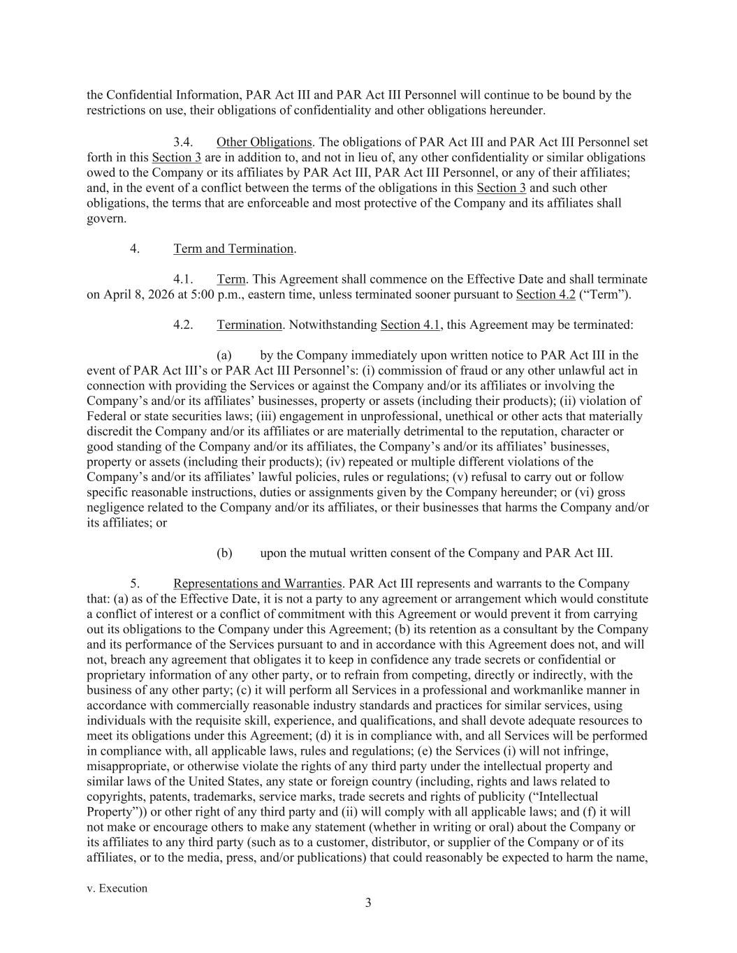 v. Execution 3 the Confidential Information, PAR Act III and PAR Act III Personnel will continue to be bound by the restrictions on use, their obligations of confidentiality and other obligations hereunder. 3.4. Other Obligations. The obligations of PAR Act III and PAR Act III Personnel set forth in this Section 3 are in addition to, and not in lieu of, any other confidentiality or similar obligations owed to the Company or its affiliates by PAR Act III, PAR Act III Personnel, or any of their affiliates; and, in the event of a conflict between the terms of the obligations in this Section 3 and such other obligations, the terms that are enforceable and most protective of the Company and its affiliates shall govern. 4. Term and Termination. 4.1. Term. This Agreement shall commence on the Effective Date and shall terminate on April 8, 2026 at 5:00 p.m., eastern time, unless terminated sooner pursuant to Section 4.2 (“Term”). 4.2. Termination. Notwithstanding Section 4.1, this Agreement may be terminated: (a) by the Company immediately upon written notice to PAR Act III in the event of PAR Act III’s or PAR Act III Personnel’s: (i) commission of fraud or any other unlawful act in connection with providing the Services or against the Company and/or its affiliates or involving the Company’s and/or its affiliates’ businesses, property or assets (including their products); (ii) violation of Federal or state securities laws; (iii) engagement in unprofessional, unethical or other acts that materially discredit the Company and/or its affiliates or are materially detrimental to the reputation, character or good standing of the Company and/or its affiliates, the Company’s and/or its affiliates’ businesses, property or assets (including their products); (iv) repeated or multiple different violations of the Company’s and/or its affiliates’ lawful policies, rules or regulations; (v) refusal to carry out or follow specific reasonable instructions, duties or assignments given by the Company hereunder; or (vi) gross negligence related to the Company and/or its affiliates, or their businesses that harms the Company and/or its affiliates; or (b) upon the mutual written consent of the Company and PAR Act III. 5. Representations and Warranties. PAR Act III represents and warrants to the Company that: (a) as of the Effective Date, it is not a party to any agreement or arrangement which would constitute a conflict of interest or a conflict of commitment with this Agreement or would prevent it from carrying out its obligations to the Company under this Agreement; (b) its retention as a consultant by the Company and its performance of the Services pursuant to and in accordance with this Agreement does not, and will not, breach any agreement that obligates it to keep in confidence any trade secrets or confidential or proprietary information of any other party, or to refrain from competing, directly or indirectly, with the business of any other party; (c) it will perform all Services in a professional and workmanlike manner in accordance with commercially reasonable industry standards and practices for similar services, using individuals with the requisite skill, experience, and qualifications, and shall devote adequate resources to meet its obligations under this Agreement; (d) it is in compliance with, and all Services will be performed in compliance with, all applicable laws, rules and regulations; (e) the Services (i) will not infringe, misappropriate, or otherwise violate the rights of any third party under the intellectual property and similar laws of the United States, any state or foreign country (including, rights and laws related to copyrights, patents, trademarks, service marks, trade secrets and rights of publicity (“Intellectual Property”)) or other right of any third party and (ii) will comply with all applicable laws; and (f) it will not make or encourage others to make any statement (whether in writing or oral) about the Company or its affiliates to any third party (such as to a customer, distributor, or supplier of the Company or of its affiliates, or to the media, press, and/or publications) that could reasonably be expected to harm the name,