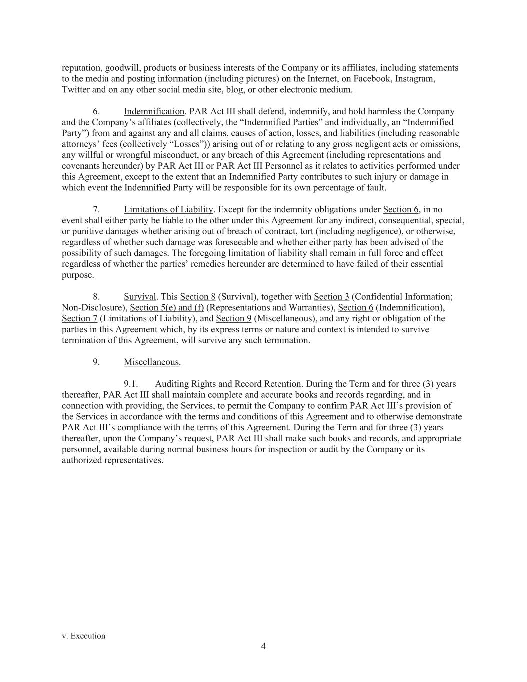 v. Execution 4 reputation, goodwill, products or business interests of the Company or its affiliates, including statements to the media and posting information (including pictures) on the Internet, on Facebook, Instagram, Twitter and on any other social media site, blog, or other electronic medium. 6. Indemnification. PAR Act III shall defend, indemnify, and hold harmless the Company and the Company’s affiliates (collectively, the “Indemnified Parties” and individually, an “Indemnified Party”) from and against any and all claims, causes of action, losses, and liabilities (including reasonable attorneys’ fees (collectively “Losses”)) arising out of or relating to any gross negligent acts or omissions, any willful or wrongful misconduct, or any breach of this Agreement (including representations and covenants hereunder) by PAR Act III or PAR Act III Personnel as it relates to activities performed under this Agreement, except to the extent that an Indemnified Party contributes to such injury or damage in which event the Indemnified Party will be responsible for its own percentage of fault. 7. Limitations of Liability. Except for the indemnity obligations under Section 6, in no event shall either party be liable to the other under this Agreement for any indirect, consequential, special, or punitive damages whether arising out of breach of contract, tort (including negligence), or otherwise, regardless of whether such damage was foreseeable and whether either party has been advised of the possibility of such damages. The foregoing limitation of liability shall remain in full force and effect regardless of whether the parties’ remedies hereunder are determined to have failed of their essential purpose. 8. Survival. This Section 8 (Survival), together with Section 3 (Confidential Information; Non-Disclosure), Section 5(e) and (f) (Representations and Warranties), Section 6 (Indemnification), Section 7 (Limitations of Liability), and Section 9 (Miscellaneous), and any right or obligation of the parties in this Agreement which, by its express terms or nature and context is intended to survive termination of this Agreement, will survive any such termination. 9. Miscellaneous. 9.1. Auditing Rights and Record Retention. During the Term and for three (3) years thereafter, PAR Act III shall maintain complete and accurate books and records regarding, and in connection with providing, the Services, to permit the Company to confirm PAR Act III’s provision of the Services in accordance with the terms and conditions of this Agreement and to otherwise demonstrate PAR Act III’s compliance with the terms of this Agreement. During the Term and for three (3) years thereafter, upon the Company’s request, PAR Act III shall make such books and records, and appropriate personnel, available during normal business hours for inspection or audit by the Company or its authorized representatives.