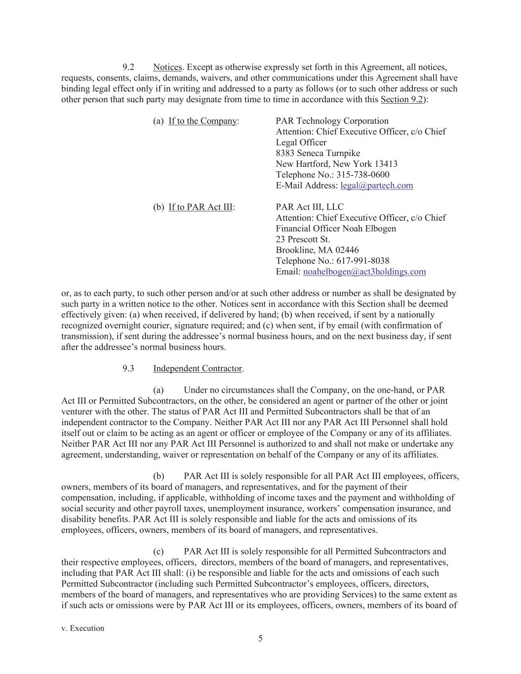 v. Execution 5 9.2 Notices. Except as otherwise expressly set forth in this Agreement, all notices, requests, consents, claims, demands, waivers, and other communications under this Agreement shall have binding legal effect only if in writing and addressed to a party as follows (or to such other address or such other person that such party may designate from time to time in accordance with this Section 9.2): (a) If to the Company: PAR Technology Corporation Attention: Chief Executive Officer, c/o Chief Legal Officer 8383 Seneca Turnpike New Hartford, New York 13413 Telephone No.: 315-738-0600 E-Mail Address: legal@partech.com (b) If to PAR Act III: PAR Act III, LLC Attention: Chief Executive Officer, c/o Chief Financial Officer Noah Elbogen 23 Prescott St. Brookline, MA 02446 Telephone No.: 617-991-8038 Email: noahelbogen@act3holdings.com or, as to each party, to such other person and/or at such other address or number as shall be designated by such party in a written notice to the other. Notices sent in accordance with this Section shall be deemed effectively given: (a) when received, if delivered by hand; (b) when received, if sent by a nationally recognized overnight courier, signature required; and (c) when sent, if by email (with confirmation of transmission), if sent during the addressee’s normal business hours, and on the next business day, if sent after the addressee’s normal business hours. 9.3 Independent Contractor. (a) Under no circumstances shall the Company, on the one-hand, or PAR Act III or Permitted Subcontractors, on the other, be considered an agent or partner of the other or joint venturer with the other. The status of PAR Act III and Permitted Subcontractors shall be that of an independent contractor to the Company. Neither PAR Act III nor any PAR Act III Personnel shall hold itself out or claim to be acting as an agent or officer or employee of the Company or any of its affiliates. Neither PAR Act III nor any PAR Act III Personnel is authorized to and shall not make or undertake any agreement, understanding, waiver or representation on behalf of the Company or any of its affiliates. (b) PAR Act III is solely responsible for all PAR Act III employees, officers, owners, members of its board of managers, and representatives, and for the payment of their compensation, including, if applicable, withholding of income taxes and the payment and withholding of social security and other payroll taxes, unemployment insurance, workers’ compensation insurance, and disability benefits. PAR Act III is solely responsible and liable for the acts and omissions of its employees, officers, owners, members of its board of managers, and representatives. (c) PAR Act III is solely responsible for all Permitted Subcontractors and their respective employees, officers, directors, members of the board of managers, and representatives, including that PAR Act III shall: (i) be responsible and liable for the acts and omissions of each such Permitted Subcontractor (including such Permitted Subcontractor’s employees, officers, directors, members of the board of managers, and representatives who are providing Services) to the same extent as if such acts or omissions were by PAR Act III or its employees, officers, owners, members of its board of