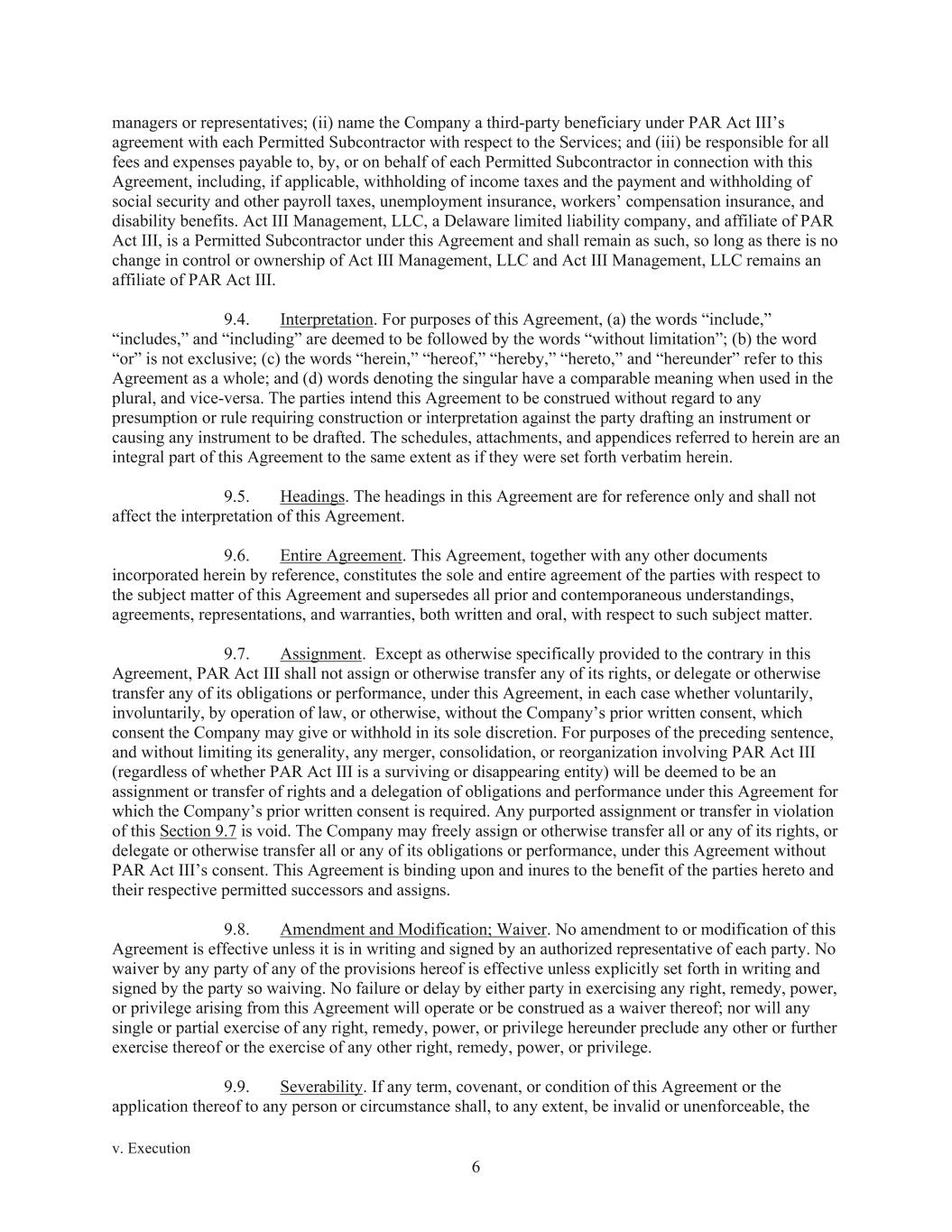 v. Execution 6 managers or representatives; (ii) name the Company a third-party beneficiary under PAR Act III’s agreement with each Permitted Subcontractor with respect to the Services; and (iii) be responsible for all fees and expenses payable to, by, or on behalf of each Permitted Subcontractor in connection with this Agreement, including, if applicable, withholding of income taxes and the payment and withholding of social security and other payroll taxes, unemployment insurance, workers’ compensation insurance, and disability benefits. Act III Management, LLC, a Delaware limited liability company, and affiliate of PAR Act III, is a Permitted Subcontractor under this Agreement and shall remain as such, so long as there is no change in control or ownership of Act III Management, LLC and Act III Management, LLC remains an affiliate of PAR Act III. 9.4. Interpretation. For purposes of this Agreement, (a) the words “include,” “includes,” and “including” are deemed to be followed by the words “without limitation”; (b) the word “or” is not exclusive; (c) the words “herein,” “hereof,” “hereby,” “hereto,” and “hereunder” refer to this Agreement as a whole; and (d) words denoting the singular have a comparable meaning when used in the plural, and vice-versa. The parties intend this Agreement to be construed without regard to any presumption or rule requiring construction or interpretation against the party drafting an instrument or causing any instrument to be drafted. The schedules, attachments, and appendices referred to herein are an integral part of this Agreement to the same extent as if they were set forth verbatim herein. 9.5. Headings. The headings in this Agreement are for reference only and shall not affect the interpretation of this Agreement. 9.6. Entire Agreement. This Agreement, together with any other documents incorporated herein by reference, constitutes the sole and entire agreement of the parties with respect to the subject matter of this Agreement and supersedes all prior and contemporaneous understandings, agreements, representations, and warranties, both written and oral, with respect to such subject matter. 9.7. Assignment. Except as otherwise specifically provided to the contrary in this Agreement, PAR Act III shall not assign or otherwise transfer any of its rights, or delegate or otherwise transfer any of its obligations or performance, under this Agreement, in each case whether voluntarily, involuntarily, by operation of law, or otherwise, without the Company’s prior written consent, which consent the Company may give or withhold in its sole discretion. For purposes of the preceding sentence, and without limiting its generality, any merger, consolidation, or reorganization involving PAR Act III (regardless of whether PAR Act III is a surviving or disappearing entity) will be deemed to be an assignment or transfer of rights and a delegation of obligations and performance under this Agreement for which the Company’s prior written consent is required. Any purported assignment or transfer in violation of this Section 9.7 is void. The Company may freely assign or otherwise transfer all or any of its rights, or delegate or otherwise transfer all or any of its obligations or performance, under this Agreement without PAR Act III’s consent. This Agreement is binding upon and inures to the benefit of the parties hereto and their respective permitted successors and assigns. 9.8. Amendment and Modification; Waiver. No amendment to or modification of this Agreement is effective unless it is in writing and signed by an authorized representative of each party. No waiver by any party of any of the provisions hereof is effective unless explicitly set forth in writing and signed by the party so waiving. No failure or delay by either party in exercising any right, remedy, power, or privilege arising from this Agreement will operate or be construed as a waiver thereof; nor will any single or partial exercise of any right, remedy, power, or privilege hereunder preclude any other or further exercise thereof or the exercise of any other right, remedy, power, or privilege. 9.9. Severability. If any term, covenant, or condition of this Agreement or the application thereof to any person or circumstance shall, to any extent, be invalid or unenforceable, the