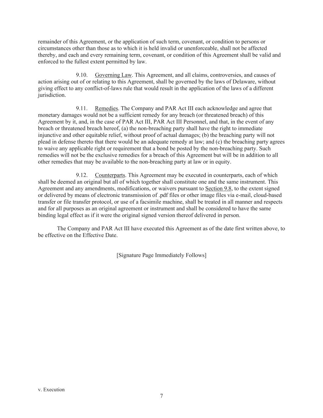 v. Execution 7 remainder of this Agreement, or the application of such term, covenant, or condition to persons or circumstances other than those as to which it is held invalid or unenforceable, shall not be affected thereby, and each and every remaining term, covenant, or condition of this Agreement shall be valid and enforced to the fullest extent permitted by law. 9.10. Governing Law. This Agreement, and all claims, controversies, and causes of action arising out of or relating to this Agreement, shall be governed by the laws of Delaware, without giving effect to any conflict-of-laws rule that would result in the application of the laws of a different jurisdiction. 9.11. Remedies. The Company and PAR Act III each acknowledge and agree that monetary damages would not be a sufficient remedy for any breach (or threatened breach) of this Agreement by it, and, in the case of PAR Act III, PAR Act III Personnel, and that, in the event of any breach or threatened breach hereof, (a) the non-breaching party shall have the right to immediate injunctive and other equitable relief, without proof of actual damages; (b) the breaching party will not plead in defense thereto that there would be an adequate remedy at law; and (c) the breaching party agrees to waive any applicable right or requirement that a bond be posted by the non-breaching party. Such remedies will not be the exclusive remedies for a breach of this Agreement but will be in addition to all other remedies that may be available to the non-breaching party at law or in equity. 9.12. Counterparts. This Agreement may be executed in counterparts, each of which shall be deemed an original but all of which together shall constitute one and the same instrument. This Agreement and any amendments, modifications, or waivers pursuant to Section 9.8, to the extent signed or delivered by means of electronic transmission of .pdf files or other image files via e-mail, cloud-based transfer or file transfer protocol, or use of a facsimile machine, shall be treated in all manner and respects and for all purposes as an original agreement or instrument and shall be considered to have the same binding legal effect as if it were the original signed version thereof delivered in person. The Company and PAR Act III have executed this Agreement as of the date first written above, to be effective on the Effective Date. [Signature Page Immediately Follows]