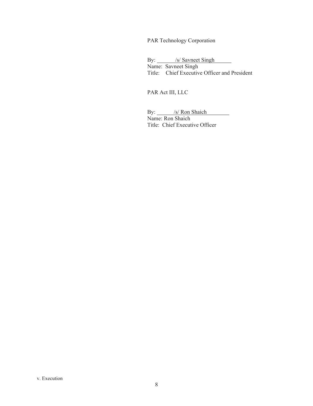 v. Execution 8 PAR Technology Corporation By: ______/s/ Savneet Singh______ Name: Savneet Singh Title: Chief Executive Officer and President PAR Act III, LLC By: ______/s/ Ron Shaich________ Name: Ron Shaich Title: Chief Executive Officer