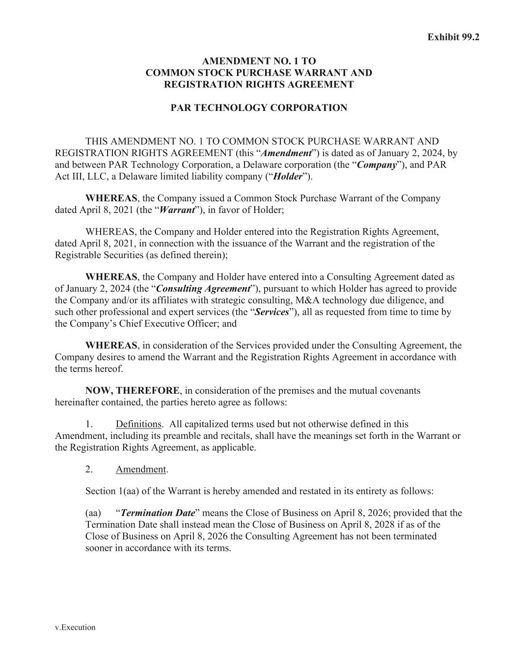 v.Execution AMENDMENT NO. 1 TO COMMON STOCK PURCHASE WARRANT AND REGISTRATION RIGHTS AGREEMENT PAR TECHNOLOGY CORPORATION THIS AMENDMENT NO. 1 TO COMMON STOCK PURCHASE WARRANT AND REGISTRATION RIGHTS AGREEMENT (this “Amendment”) is dated as of January 2, 2024, by and between PAR Technology Corporation, a Delaware corporation (the “Company”), and PAR Act III, LLC, a Delaware limited liability company (“Holder”). WHEREAS, the Company issued a Common Stock Purchase Warrant of the Company dated April 8, 2021 (the “Warrant”), in favor of Holder; WHEREAS, the Company and Holder entered into the Registration Rights Agreement, dated April 8, 2021, in connection with the issuance of the Warrant and the registration of the Registrable Securities (as defined therein); WHEREAS, the Company and Holder have entered into a Consulting Agreement dated as of January 2, 2024 (the “Consulting Agreement”), pursuant to which Holder has agreed to provide the Company and/or its affiliates with strategic consulting, M&A technology due diligence, and such other professional and expert services (the “Services”), all as requested from time to time by the Company’s Chief Executive Officer; and WHEREAS, in consideration of the Services provided under the Consulting Agreement, the Company desires to amend the Warrant and the Registration Rights Agreement in accordance with the terms hereof. NOW, THEREFORE, in consideration of the premises and the mutual covenants hereinafter contained, the parties hereto agree as follows: 1. Definitions. All capitalized terms used but not otherwise defined in this Amendment, including its preamble and recitals, shall have the meanings set forth in the Warrant or the Registration Rights Agreement, as applicable. 2. Amendment. Section 1(aa) of the Warrant is hereby amended and restated in its entirety as follows: (aa) “Termination Date” means the Close of Business on April 8, 2026; provided that the Termination Date shall instead mean the Close of Business on April 8, 2028 if as of the Close of Business on April 8, 2026 the Consulting Agreement has not been terminated sooner in accordance with its terms. Exhibit 99.2
