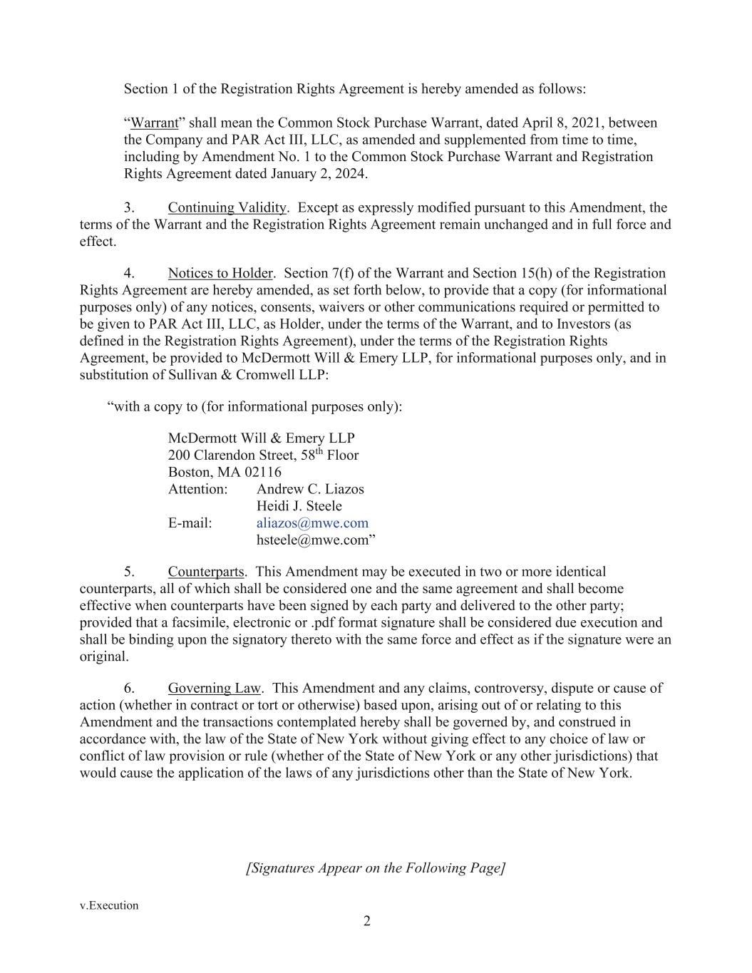 v.Execution 2 Section 1 of the Registration Rights Agreement is hereby amended as follows: “Warrant” shall mean the Common Stock Purchase Warrant, dated April 8, 2021, between the Company and PAR Act III, LLC, as amended and supplemented from time to time, including by Amendment No. 1 to the Common Stock Purchase Warrant and Registration Rights Agreement dated January 2, 2024. 3. Continuing Validity. Except as expressly modified pursuant to this Amendment, the terms of the Warrant and the Registration Rights Agreement remain unchanged and in full force and effect. 4. Notices to Holder. Section 7(f) of the Warrant and Section 15(h) of the Registration Rights Agreement are hereby amended, as set forth below, to provide that a copy (for informational purposes only) of any notices, consents, waivers or other communications required or permitted to be given to PAR Act III, LLC, as Holder, under the terms of the Warrant, and to Investors (as defined in the Registration Rights Agreement), under the terms of the Registration Rights Agreement, be provided to McDermott Will & Emery LLP, for informational purposes only, and in substitution of Sullivan & Cromwell LLP: “with a copy to (for informational purposes only): McDermott Will & Emery LLP 200 Clarendon Street, 58th Floor Boston, MA 02116 Attention: Andrew C. Liazos Heidi J. Steele E-mail: aliazos@mwe.com hsteele@mwe.com” 5. Counterparts. This Amendment may be executed in two or more identical counterparts, all of which shall be considered one and the same agreement and shall become effective when counterparts have been signed by each party and delivered to the other party; provided that a facsimile, electronic or .pdf format signature shall be considered due execution and shall be binding upon the signatory thereto with the same force and effect as if the signature were an original. 6. Governing Law. This Amendment and any claims, controversy, dispute or cause of action (whether in contract or tort or otherwise) based upon, arising out of or relating to this Amendment and the transactions contemplated hereby shall be governed by, and construed in accordance with, the law of the State of New York without giving effect to any choice of law or conflict of law provision or rule (whether of the State of New York or any other jurisdictions) that would cause the application of the laws of any jurisdictions other than the State of New York. [Signatures Appear on the Following Page]