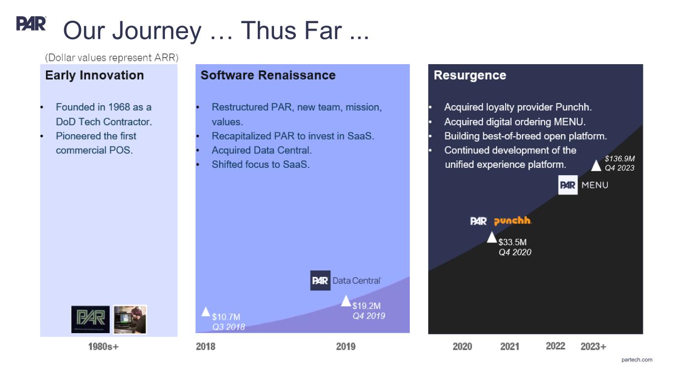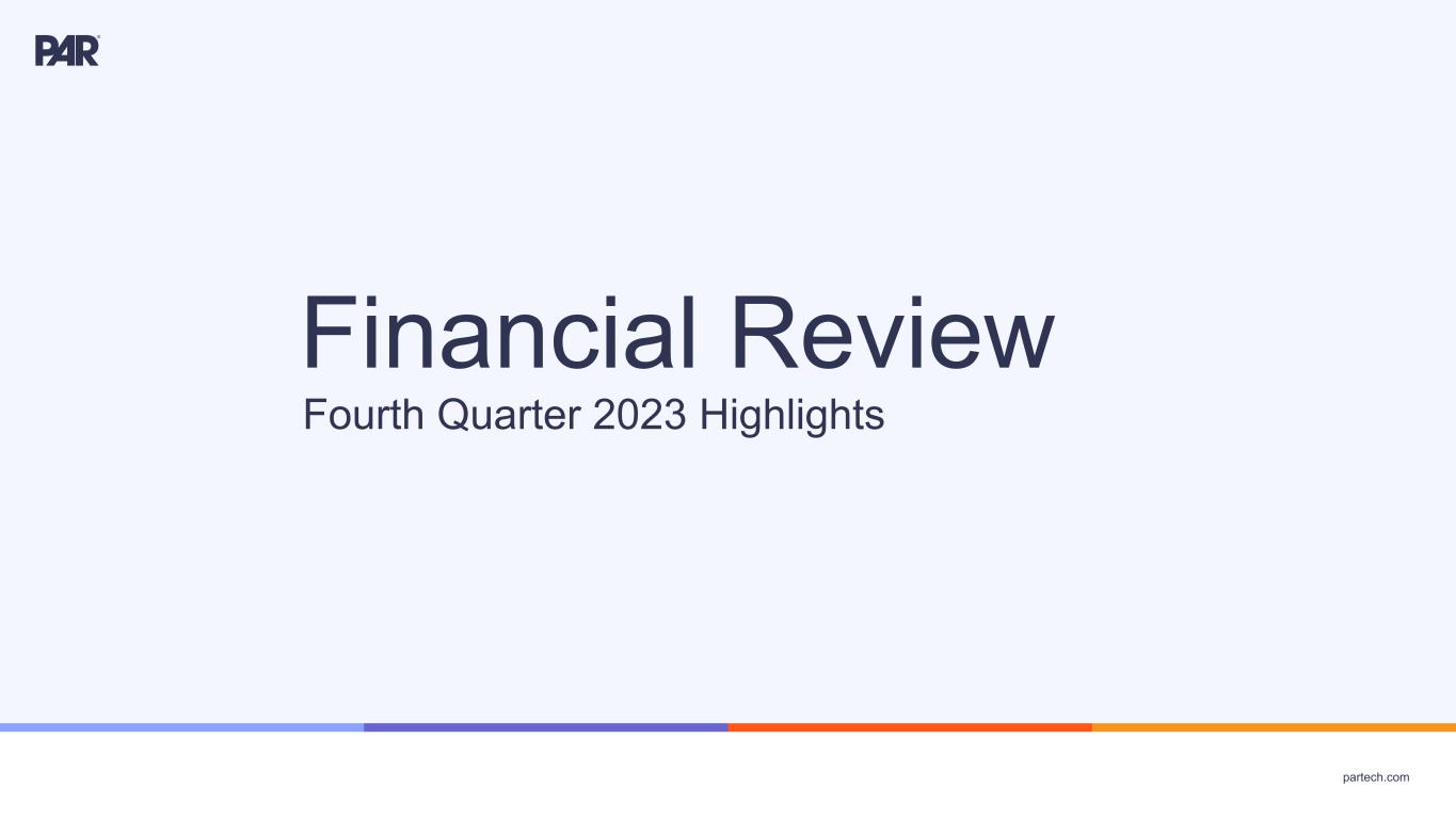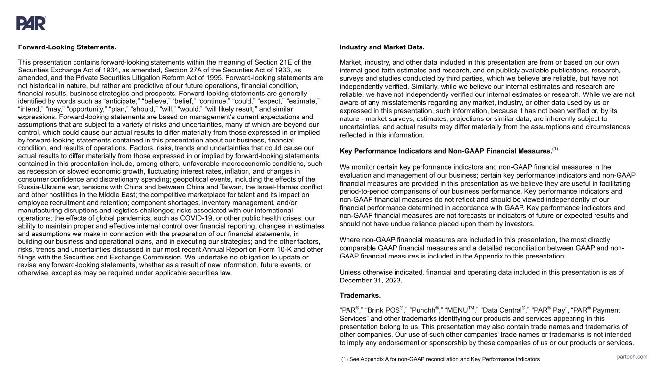 partech.com Forward-Looking Statements. This presentation contains forward-looking statements within the meaning of Section 21E of the Securities Exchange Act of 1934, as amended, Section 27A of the Securities Act of 1933, as amended, and the Private Securities Litigation Reform Act of 1995. Forward-looking statements are not historical in nature, but rather are predictive of our future operations, financial condition, financial results, business strategies and prospects. Forward-looking statements are generally identified by words such as “anticipate,” “believe,” “belief,” “continue,” “could,” “expect,” “estimate,” “intend,” “may,” “opportunity,” “plan,” “should,” “will,” “would,” “will likely result,” and similar expressions. Forward-looking statements are based on management's current expectations and assumptions that are subject to a variety of risks and uncertainties, many of which are beyond our control, which could cause our actual results to differ materially from those expressed in or implied by forward-looking statements contained in this presentation about our business, financial condition, and results of operations. Factors, risks, trends and uncertainties that could cause our actual results to differ materially from those expressed in or implied by forward-looking statements contained in this presentation include, among others, unfavorable macroeconomic conditions, such as recession or slowed economic growth, fluctuating interest rates, inflation, and changes in consumer confidence and discretionary spending; geopolitical events, including the effects of the Russia-Ukraine war, tensions with China and between China and Taiwan, the Israel-Hamas conflict and other hostilities in the Middle East; the competitive marketplace for talent and its impact on employee recruitment and retention; component shortages, inventory management, and/or manufacturing disruptions and logistics challenges; risks associated with our international operations; the effects of global pandemics, such as COVID-19, or other public health crises; our ability to maintain proper and effective internal control over financial reporting; changes in estimates and assumptions we make in connection with the preparation of our financial statements, in building our business and operational plans, and in executing our strategies; and the other factors, risks, trends and uncertainties discussed in our most recent Annual Report on Form 10-K and other filings with the Securities and Exchange Commission. We undertake no obligation to update or revise any forward-looking statements, whether as a result of new information, future events, or otherwise, except as may be required under applicable securities law. Industry and Market Data. Market, industry, and other data included in this presentation are from or based on our own internal good faith estimates and research, and on publicly available publications, research, surveys and studies conducted by third parties, which we believe are reliable, but have not independently verified. Similarly, while we believe our internal estimates and research are reliable, we have not independently verified our internal estimates or research. While we are not aware of any misstatements regarding any market, industry, or other data used by us or expressed in this presentation, such information, because it has not been verified or, by its nature - market surveys, estimates, projections or similar data, are inherently subject to uncertainties, and actual results may differ materially from the assumptions and circumstances reflected in this information. Key Performance Indicators and Non-GAAP Financial Measures.(1) We monitor certain key performance indicators and non-GAAP financial measures in the evaluation and management of our business; certain key performance indicators and non-GAAP financial measures are provided in this presentation as we believe they are useful in facilitating period-to-period comparisons of our business performance. Key performance indicators and non-GAAP financial measures do not reflect and should be viewed independently of our financial performance determined in accordance with GAAP. Key performance indicators and non-GAAP financial measures are not forecasts or indicators of future or expected results and should not have undue reliance placed upon them by investors. Where non-GAAP financial measures are included in this presentation, the most directly comparable GAAP financial measures and a detailed reconciliation between GAAP and non- GAAP financial measures is included in the Appendix to this presentation. Unless otherwise indicated, financial and operating data included in this presentation is as of December 31, 2023. Trademarks. “PAR®,” “Brink POS®,” “Punchh®,” “MENUTM,” “Data Central®,” "PAR® Pay”, “PAR® Payment Services” and other trademarks identifying our products and services appearing in this presentation belong to us. This presentation may also contain trade names and trademarks of other companies. Our use of such other companies’ trade names or trademarks is not intended to imply any endorsement or sponsorship by these companies of us or our products or services. (1) See Appendix A for non-GAAP reconciliation and Key Performance Indicators