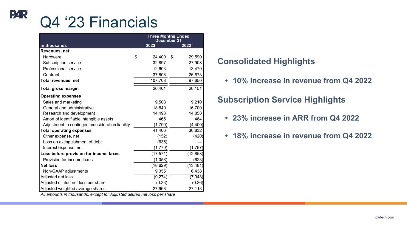 partech.com Q4 ‘23 Financials Consolidated Highlights • 10% increase in revenue from Q4 2022 Subscription Service Highlights • 23% increase in ARR from Q4 2022 • 18% increase in revenue from Q4 2022 Three Months Ended December 31 in thousands 2023 2022 Revenues, net: Hardware $ 24,400 $ 29,590 Subscription service 32,897 27,908 Professional service 12,603 13,479 Contract 37,808 26,673 Total revenues, net 107,708 97,650 Total gross margin 26,401 26,151 Operating expenses Sales and marketing 9,508 9,210 General and administrative 18,640 16,700 Research and development 14,493 14,858 Amort of identifiable intangible assets 465 464 Adjustment to contingent consideration liability (1,700) (4,400) Total operating expenses 41,406 36,832 Other expense, net (152) (420) Loss on extinguishment of debt (635) — Interest expense, net (1,779) (1,757) Loss before provision for income taxes (17,571) (12,858) Provision for income taxes (1,058) (623) Net loss (18,629) (13,481) Non-GAAP adjustments 9,355 6,438 Adjusted net loss (9,274) (7,043) Adjusted diluted net loss per share (0.33) (0.26) Adjusted weighted average shares 27,968 27,118 All amounts in thousands, except for Adjusted diluted net loss per share