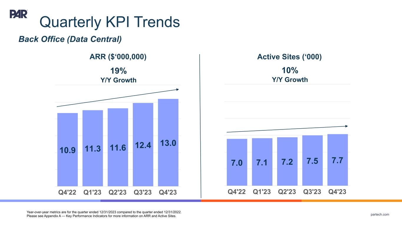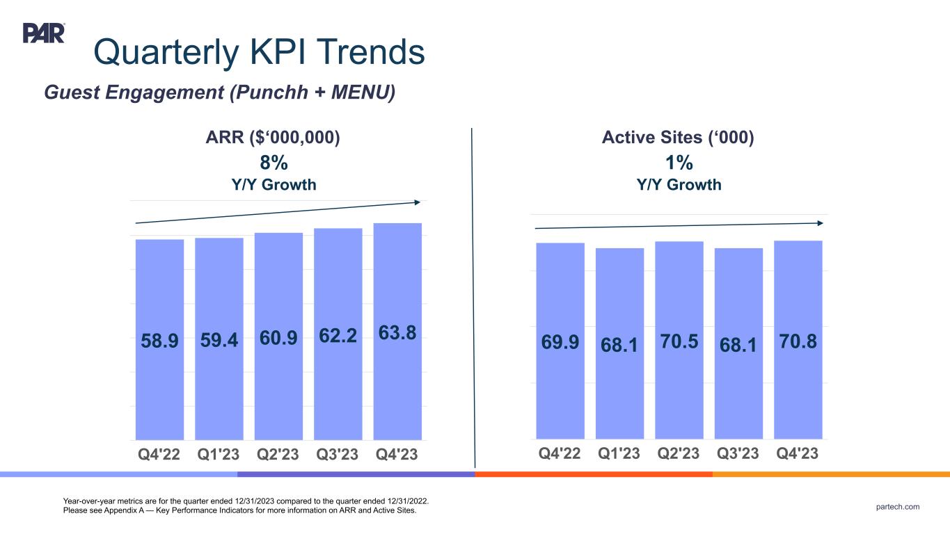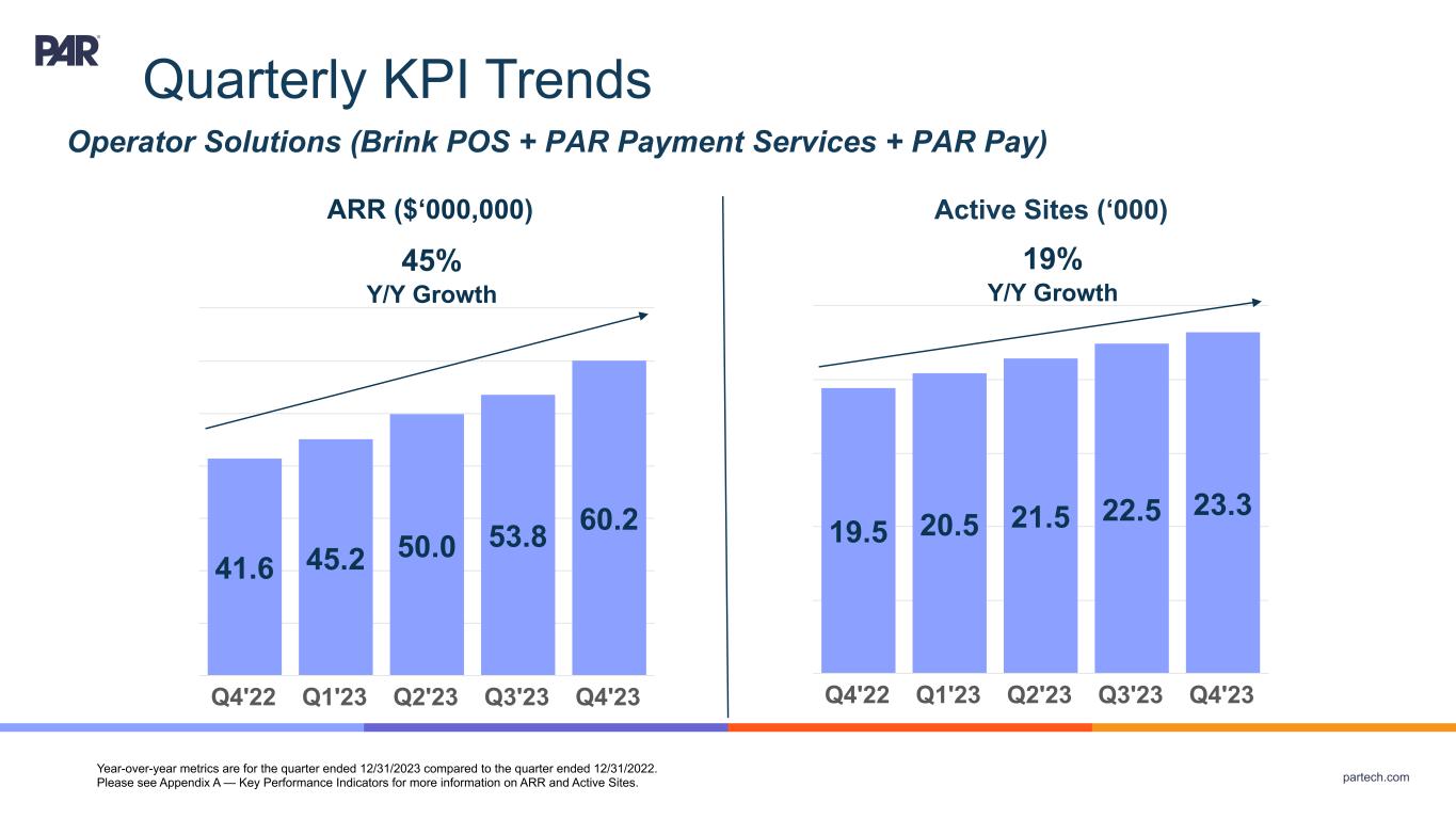 partech.com Quarterly KPI Trends Operator Solutions (Brink POS + PAR Payment Services + PAR Pay) ARR ($‘000,000) Year-over-year metrics are for the quarter ended 12/31/2023 compared to the quarter ended 12/31/2022. Please see Appendix A — Key Performance Indicators for more information on ARR and Active Sites. 41.6 45.2 50.0 53.8 60.2 Q4'22 Q1'23 Q2'23 Q3'23 Q4'23 45% Y/Y Growth Active Sites (‘000) 19.5 20.5 21.5 22.5 23.3 Q4'22 Q1'23 Q2'23 Q3'23 Q4'23 19% Y/Y Growth