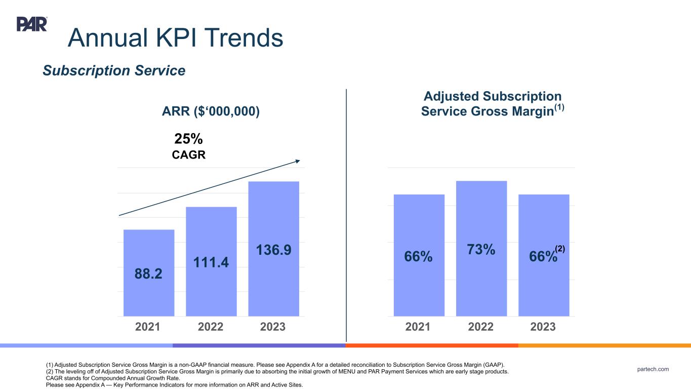 partech.com Annual KPI Trends ARR ($‘000,000) (1) Adjusted Subscription Service Gross Margin is a non-GAAP financial measure. Please see Appendix A for a detailed reconciliation to Subscription Service Gross Margin (GAAP). (2) The leveling off of Adjusted Subscription Service Gross Margin is primarily due to absorbing the initial growth of MENU and PAR Payment Services which are early stage products. CAGR stands for Compounded Annual Growth Rate. Please see Appendix A — Key Performance Indicators for more information on ARR and Active Sites. 88.2 111.4 136.9 2021 2022 2023 Subscription Service 25% CAGR Adjusted Subscription Service Gross Margin(1) 66% 73% 66% 2021 2022 2023 (2)