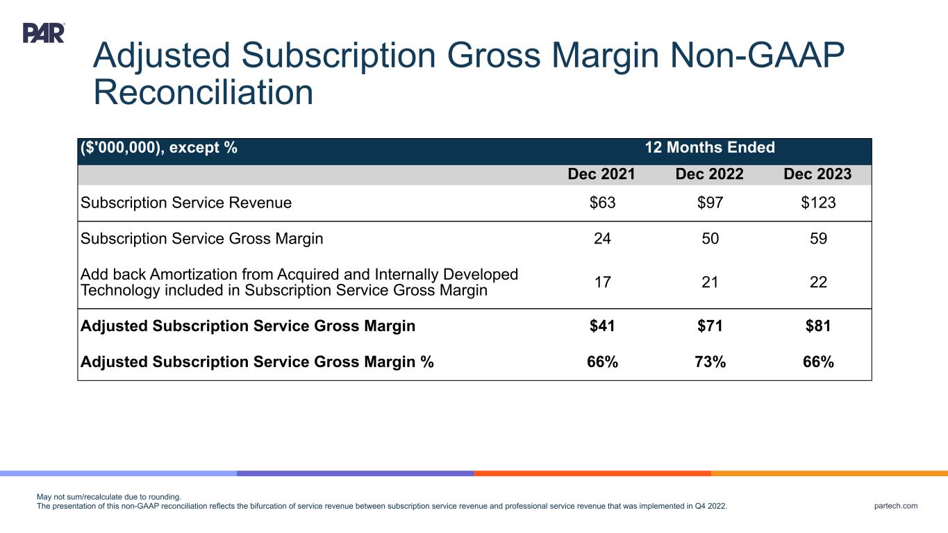 partech.com ($'000,000), except % 12 Months Ended Dec 2021 Dec 2022 Dec 2023 Subscription Service Revenue $63 $97 $123 Subscription Service Gross Margin 24 50 59 Add back Amortization from Acquired and Internally Developed Technology included in Subscription Service Gross Margin 17 21 22 Adjusted Subscription Service Gross Margin $41 $71 $81 Adjusted Subscription Service Gross Margin % 66% 73% 66% May not sum/recalculate due to rounding. The presentation of this non-GAAP reconciliation reflects the bifurcation of service revenue between subscription service revenue and professional service revenue that was implemented in Q4 2022. Adjusted Subscription Gross Margin Non-GAAP Reconciliation