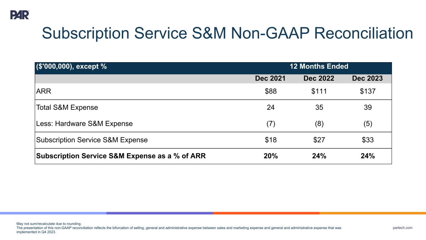 partech.com ($'000,000), except % 12 Months Ended Dec 2021 Dec 2022 Dec 2023 ARR $88 $111 $137 Total S&M Expense 24 35 39 Less: Hardware S&M Expense (7) (8) (5) Subscription Service S&M Expense $18 $27 $33 Subscription Service S&M Expense as a % of ARR 20% 24% 24% May not sum/recalculate due to rounding. The presentation of this non-GAAP reconciliation reflects the bifurcation of selling, general and administrative expense between sales and marketing expense and general and administrative expense that was implemented in Q4 2023. Subscription Service S&M Non-GAAP Reconciliation