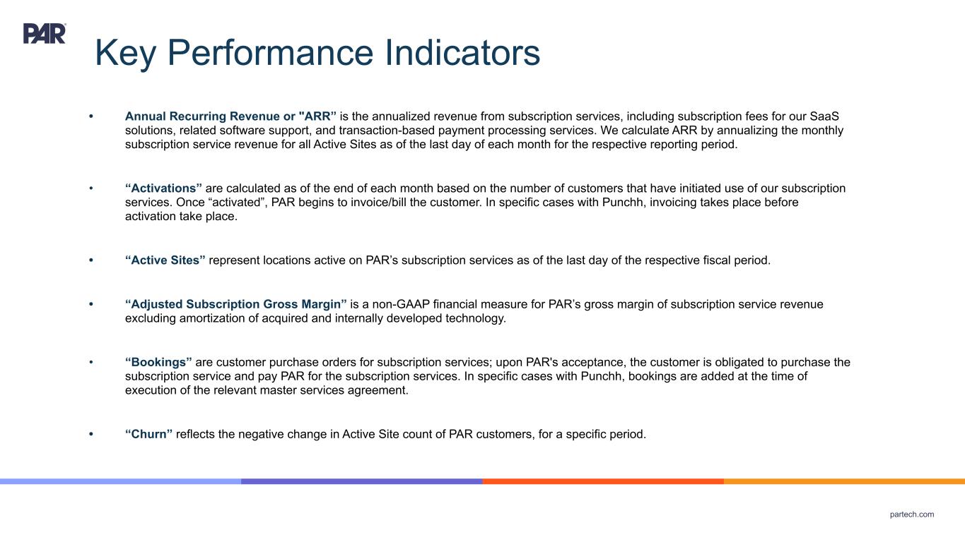 partech.com • Annual Recurring Revenue or "ARR” is the annualized revenue from subscription services, including subscription fees for our SaaS solutions, related software support, and transaction-based payment processing services. We calculate ARR by annualizing the monthly subscription service revenue for all Active Sites as of the last day of each month for the respective reporting period. • “Activations” are calculated as of the end of each month based on the number of customers that have initiated use of our subscription services. Once “activated”, PAR begins to invoice/bill the customer. In specific cases with Punchh, invoicing takes place before activation take place. • “Active Sites” represent locations active on PAR’s subscription services as of the last day of the respective fiscal period. • “Adjusted Subscription Gross Margin” is a non-GAAP financial measure for PAR’s gross margin of subscription service revenue excluding amortization of acquired and internally developed technology. • “Bookings” are customer purchase orders for subscription services; upon PAR's acceptance, the customer is obligated to purchase the subscription service and pay PAR for the subscription services. In specific cases with Punchh, bookings are added at the time of execution of the relevant master services agreement. • “Churn” reflects the negative change in Active Site count of PAR customers, for a specific period. Key Performance Indicators