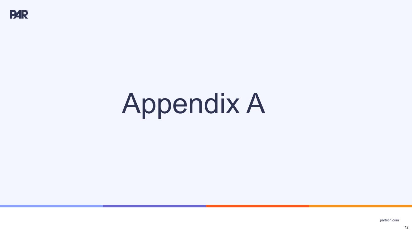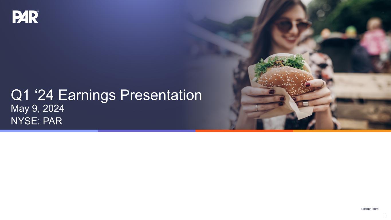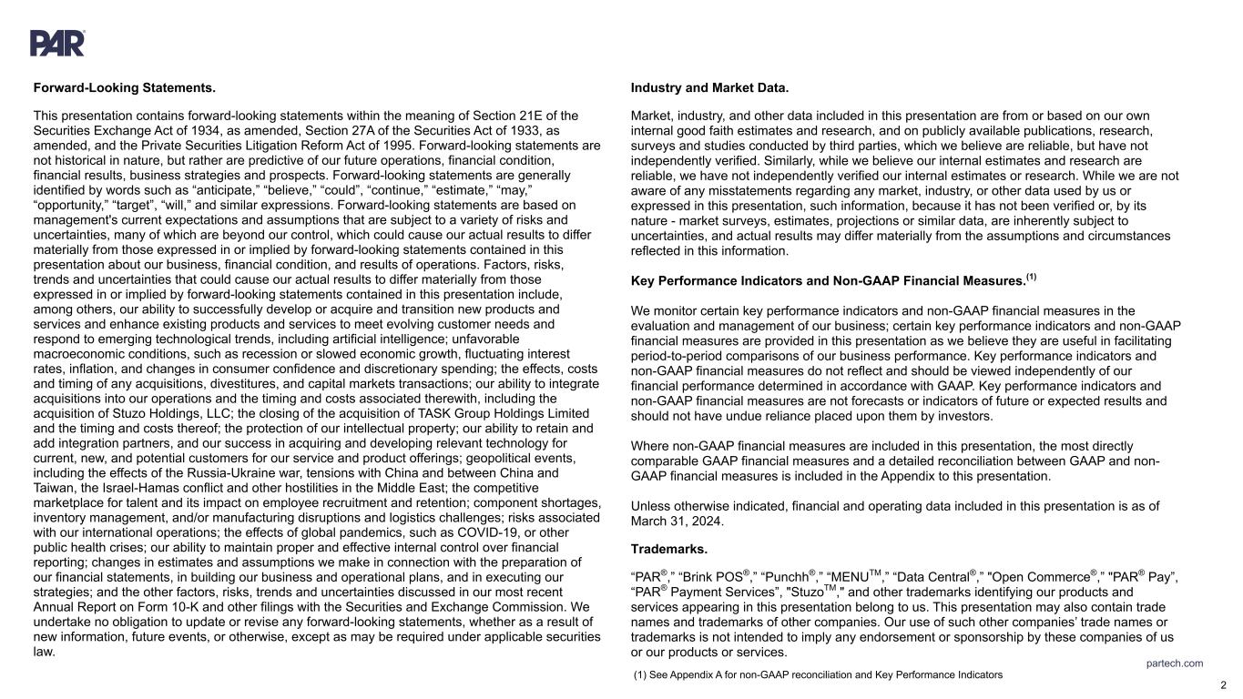 partech.com Forward-Looking Statements. This presentation contains forward-looking statements within the meaning of Section 21E of the Securities Exchange Act of 1934, as amended, Section 27A of the Securities Act of 1933, as amended, and the Private Securities Litigation Reform Act of 1995. Forward-looking statements are not historical in nature, but rather are predictive of our future operations, financial condition, financial results, business strategies and prospects. Forward-looking statements are generally identified by words such as “anticipate,” “believe,” “could”, “continue,” “estimate,” “may,” “opportunity,” “target”, “will,” and similar expressions. Forward-looking statements are based on management's current expectations and assumptions that are subject to a variety of risks and uncertainties, many of which are beyond our control, which could cause our actual results to differ materially from those expressed in or implied by forward-looking statements contained in this presentation about our business, financial condition, and results of operations. Factors, risks, trends and uncertainties that could cause our actual results to differ materially from those expressed in or implied by forward-looking statements contained in this presentation include, among others, our ability to successfully develop or acquire and transition new products and services and enhance existing products and services to meet evolving customer needs and respond to emerging technological trends, including artificial intelligence; unfavorable macroeconomic conditions, such as recession or slowed economic growth, fluctuating interest rates, inflation, and changes in consumer confidence and discretionary spending; the effects, costs and timing of any acquisitions, divestitures, and capital markets transactions; our ability to integrate acquisitions into our operations and the timing and costs associated therewith, including the acquisition of Stuzo Holdings, LLC; the closing of the acquisition of TASK Group Holdings Limited and the timing and costs thereof; the protection of our intellectual property; our ability to retain and add integration partners, and our success in acquiring and developing relevant technology for current, new, and potential customers for our service and product offerings; geopolitical events, including the effects of the Russia-Ukraine war, tensions with China and between China and Taiwan, the Israel-Hamas conflict and other hostilities in the Middle East; the competitive marketplace for talent and its impact on employee recruitment and retention; component shortages, inventory management, and/or manufacturing disruptions and logistics challenges; risks associated with our international operations; the effects of global pandemics, such as COVID-19, or other public health crises; our ability to maintain proper and effective internal control over financial reporting; changes in estimates and assumptions we make in connection with the preparation of our financial statements, in building our business and operational plans, and in executing our strategies; and the other factors, risks, trends and uncertainties discussed in our most recent Annual Report on Form 10-K and other filings with the Securities and Exchange Commission. We undertake no obligation to update or revise any forward-looking statements, whether as a result of new information, future events, or otherwise, except as may be required under applicable securities law. Industry and Market Data. Market, industry, and other data included in this presentation are from or based on our own internal good faith estimates and research, and on publicly available publications, research, surveys and studies conducted by third parties, which we believe are reliable, but have not independently verified. Similarly, while we believe our internal estimates and research are reliable, we have not independently verified our internal estimates or research. While we are not aware of any misstatements regarding any market, industry, or other data used by us or expressed in this presentation, such information, because it has not been verified or, by its nature - market surveys, estimates, projections or similar data, are inherently subject to uncertainties, and actual results may differ materially from the assumptions and circumstances reflected in this information. Key Performance Indicators and Non-GAAP Financial Measures.(1) We monitor certain key performance indicators and non-GAAP financial measures in the evaluation and management of our business; certain key performance indicators and non-GAAP financial measures are provided in this presentation as we believe they are useful in facilitating period-to-period comparisons of our business performance. Key performance indicators and non-GAAP financial measures do not reflect and should be viewed independently of our financial performance determined in accordance with GAAP. Key performance indicators and non-GAAP financial measures are not forecasts or indicators of future or expected results and should not have undue reliance placed upon them by investors. Where non-GAAP financial measures are included in this presentation, the most directly comparable GAAP financial measures and a detailed reconciliation between GAAP and non- GAAP financial measures is included in the Appendix to this presentation. Unless otherwise indicated, financial and operating data included in this presentation is as of March 31, 2024. Trademarks. “PAR®,” “Brink POS®,” “Punchh®,” “MENUTM,” “Data Central®,” "Open Commerce®,” "PAR® Pay”, “PAR® Payment Services”, "StuzoTM," and other trademarks identifying our products and services appearing in this presentation belong to us. This presentation may also contain trade names and trademarks of other companies. Our use of such other companies’ trade names or trademarks is not intended to imply any endorsement or 