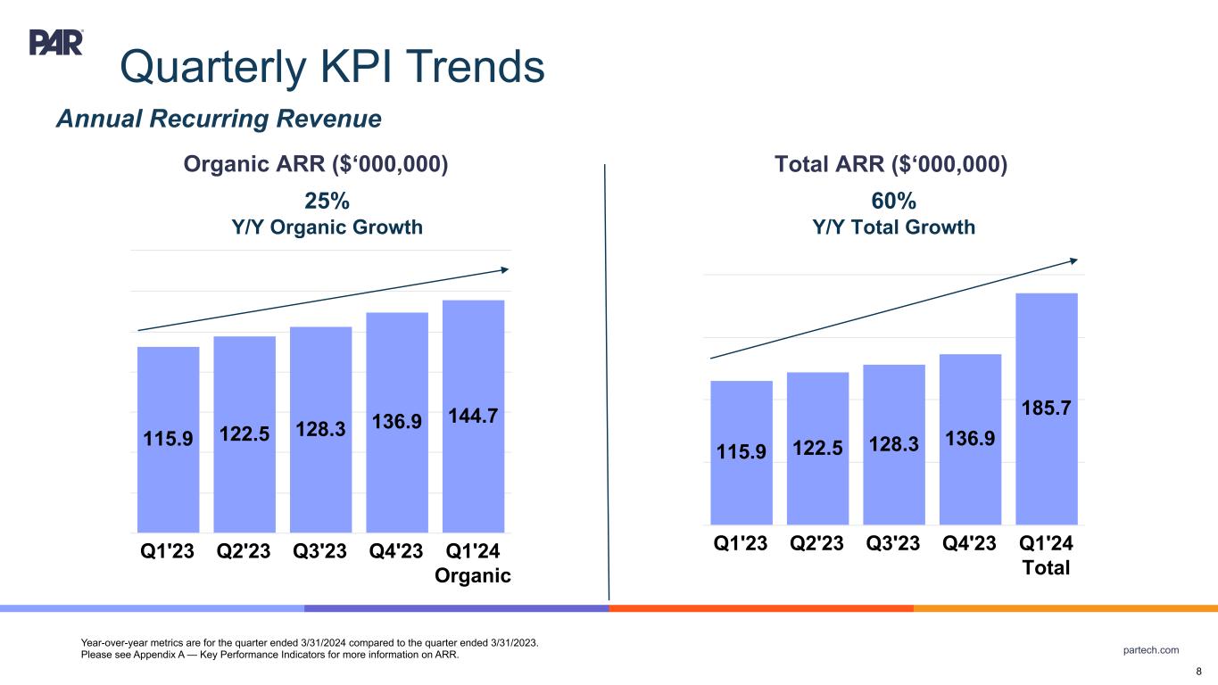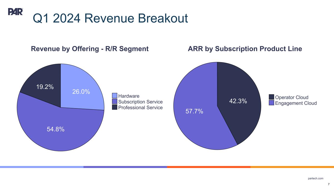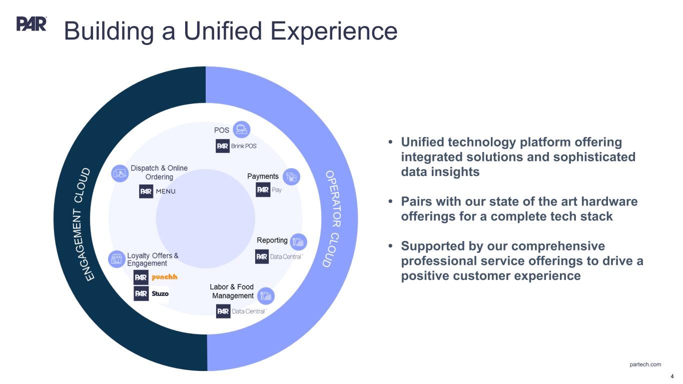 partech.com Forward-Looking Statements. This presentation contains forward-looking statements within the meaning of Section 21E of the Securities Exchange Act of 1934, as amended, Section 27A of the Securities Act of 1933, as amended, and the Private Securities Litigation Reform Act of 1995. Forward-looking statements are not historical in nature, but rather are predictive of our future operations, financial condition, financial results, business strategies and prospects. Forward-looking statements are generally identified by words such as “anticipate,” “believe,” “could”, “continue,” “estimate,” “may,” “opportunity,” “target”, “will,” and similar expressions. Forward-looking statements are based on management's current expectations and assumptions that are subject to a variety of risks and uncertainties, many of which are beyond our control, which could cause our actual results to differ materially from those expressed in or implied by forward-looking statements contained in this presentation about our business, financial condition, and results of operations. Factors, risks, trends and uncertainties that could cause our actual results to differ materially from those expressed in or implied by forward-looking statements contained in this presentation include, among others, our ability to successfully develop or acquire and transition new products and services and enhance existing products and services to meet evolving customer needs and respond to emerging technological trends, including artificial intelligence; unfavorable macroeconomic conditions, such as recession or slowed economic growth, fluctuating interest rates, inflation, and changes in consumer confidence and discretionary spending; the effects, costs and timing of any acquisitions, divestitures, and capital markets transactions; our ability to integrate acquisitions into our operations and the timing and costs associated therewith, including the acquisition of Stuzo Holdings, LLC; the closing of the acquisition of TASK Group Holdings Limited and the timing and costs thereof; the protection of our intellectual property; our ability to retain and add integration partners, and our success in acquiring and developing relevant technology for current, new, and potential customers for our service and product offerings; geopolitical events, including the effects of the Russia-Ukraine war, tensions with China and between China and Taiwan, the Israel-Hamas conflict and other hostilities in the Middle East; the competitive marketplace for talent and its impact on employee recruitment and retention; component shortages, inventory management, and/or manufacturing disruptions and logistics challenges; risks associated with our international operations; the effects of global pandemics, such as COVID-19, or other public health crises; our ability to maintain proper and effective internal control over financial reporting; changes in estimates and assumptions we make in connection with the preparation of our financial statements, in building our business and operational plans, and in executing our strategies; and the other factors, risks, trends and uncertainties discussed in our most recent Annual Report on Form 10-K and other filings with the Securities and Exchange Commission. We undertake no obligation to update or revise any forward-looking statements, whether as a result of new information, future events, or otherwise, except as may be required under applicable securities law. Industry and Market Data. Market, industry, and other data included in this presentation are from or based on our own internal good faith estimates and research, and on publicly available publications, research, surveys and studies conducted by third parties, which we believe are reliable, but have not independently verified. Similarly, while we believe our internal estimates and research are reliable, we have not independently verified our internal estimates or research. While we are not aware of any misstatements regarding any market, industry, or other data used by us or expressed in this presentation, such information, because it has not been verified or, by its nature - market surveys, estimates, projections or similar data, are inherently subject to uncertainties, and actual results may differ materially from the assumptions and circumstances reflected in this information. Key Performance Indicators and Non-GAAP Financial Measures.(1) We monitor certain key performance indicators and non-GAAP financial measures in the evaluation and management of our business; certain key performance indicators and non-GAAP financial measures are provided in this presentation as we believe they are useful in facilitating period-to-period comparisons of our business performance. Key performance indicators and non-GAAP financial measures do not reflect and should be viewed independently of our financial performance determined in accordance with GAAP. Key performance indicators and non-GAAP financial measures are not forecasts or indicators of future or expected results and should not have undue reliance placed upon them by investors. Where non-GAAP financial measures are included in this presentation, the most directly comparable GAAP financial measures and a detailed reconciliation between GAAP and non- GAAP financial measures is included in the Appendix to this presentation. Unless otherwise indicated, financial and operating data included in this presentation is as of March 31, 2024. Trademarks. “PAR®,” “Brink POS®,” “Punchh®,” “MENUTM,” “Data Central®,” "Open Commerce®,” "PAR® Pay”, “PAR® Payment Services”, "StuzoTM," and other trademarks identifying our products and services appearing in this presentation belong to us. This presentation may also contain trade names and trademarks of other companies. Our use of such other companies’ trade names or trademarks is not intended to imply any endorsement or 
