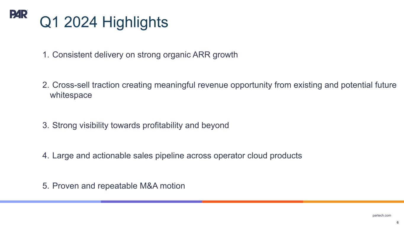 partech.com Q1 2024 Highlights 1. Consistent delivery on strong organic ARR growth 2. Cross-sell traction creating meaningful revenue opportunity from existing and potential future whitespace 3. Strong visibility towards profitability and beyond 4. Large and actionable sales pipeline across operator cloud products 5. Proven and repeatable M&A motion 6