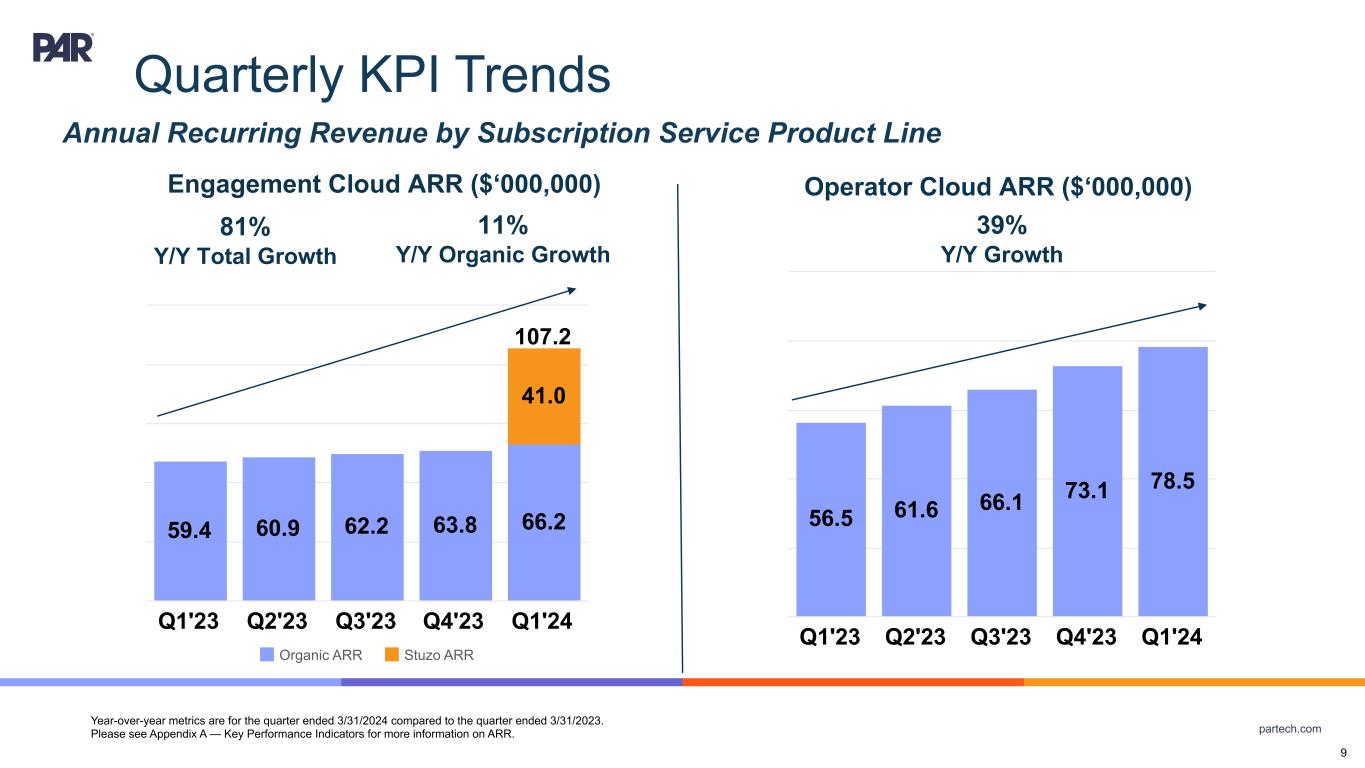 partech.com Quarterly KPI Trends Year-over-year metrics are for the quarter ended 3/31/2024 compared to the quarter ended 3/31/2023. Please see Appendix A — Key Performance Indicators for more information on ARR. 115.9 122.5 128.3 136.9 144.7 Q1'23 Q2'23 Q3'23 Q4'23 Q1'24 Organic 115.9 122.5 128.3 136.9 185.7 Q1'23 Q2'23 Q3'23 Q4'23 Q1'24 Total Annual Recurring Revenue 8 Organic ARR ($‘000,000) 25% Y/Y Organic Growth Total ARR ($‘000,000) 60% Y/Y Total Growth
