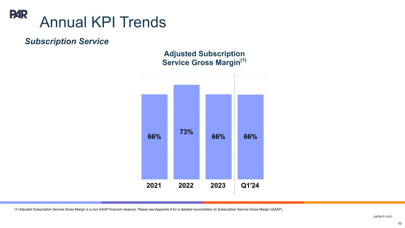 partech.com Quarterly KPI Trends Engagement Cloud ARR ($‘000,000) Year-over-year metrics are for the quarter ended 3/31/2024 compared to the quarter ended 3/31/2023. Please see Appendix A — Key Performance Indicators for more information on ARR. 59.4 60.9 62.2 63.8 66.2 41.0 Organic ARR Stuzo ARR Q1'23 Q2'23 Q3'23 Q4'23 Q1'24 81% Y/Y Total Growth Operator Cloud ARR ($‘000,000) 56.5 61.6 66.1 73.1 78.5 Q1'23 Q2'23 Q3'23 Q4'23 Q1'24 39% Y/Y Growth Annual Recurring Revenue by Subscription Service Product Line 9 11% Y/Y Organic Growth 107.2