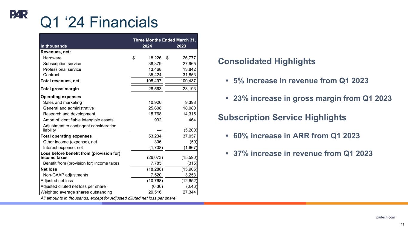 partech.com Q1 ‘24 Financials Consolidated Highlights • 5% increase in revenue from Q1 2023 • 23% increase in gross margin from Q1 2023 Subscription Service Highlights • 60% increase in ARR from Q1 2023 • 37% increase in revenue from Q1 2023 Three Months Ended March 31, in thousands 2024 2023 Revenues, net: Hardware $ 18,226 $ 26,777 Subscription service 38,379 27,965 Professional service 13,468 13,842 Contract 35,424 31,853 Total revenues, net 105,497 100,437 Total gross margin 28,563 23,193 Operating expenses Sales and marketing 10,926 9,398 General and administrative 25,608 18,080 Research and development 15,768 14,315 Amort of identifiable intangible assets 932 464 Adjustment to contingent consideration liability — (5,200) Total operating expenses 53,234 37,057 Other income (expense), net 306 (59) Interest expense, net (1,708) (1,667) Loss before benefit from (provision for) income taxes (26,073) (15,590) Benefit from (provision for) income taxes 7,785 (315) Net loss (18,288) (15,905) Non-GAAP adjustments 7,520 3,253 Adjusted net loss (10,768) (12,652) Adjusted diluted net loss per share (0.36) (0.46) Weighted average shares outstanding 29,516 27,344 All amounts in thousands, except for Adjusted diluted net loss per share 11