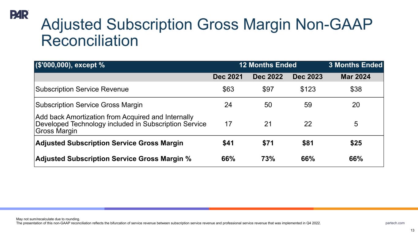 partech.com ($'000,000), except % 12 Months Ended 3 Months Ended Dec 2021 Dec 2022 Dec 2023 Mar 2024 Subscription Service Revenue $63 $97 $123 $38 Subscription Service Gross Margin 24 50 59 20 Add back Amortization from Acquired and Internally Developed Technology included in Subscription Service Gross Margin 17 21 22 5 Adjusted Subscription Service Gross Margin $41 $71 $81 $25 Adjusted Subscription Service Gross Margin % 66% 73% 66% 66% May not sum/recalculate due to rounding. The presentation of this non-GAAP reconciliation reflects the bifurcation of service revenue between subscription service revenue and professional service revenue that was implemented in Q4 2022. Adjusted Subscription Gross Margin Non-GAAP Reconciliation 13